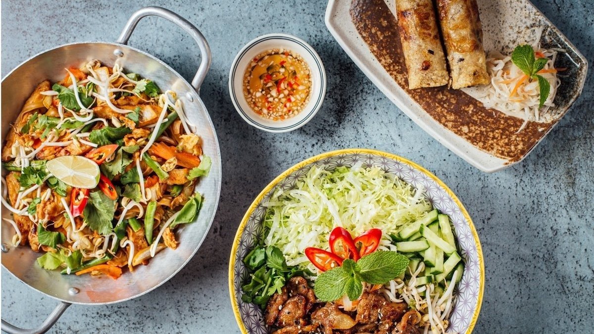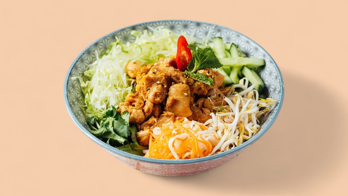 Rice noodle salad with crispy fried spring rolls (vegan option available upon request)