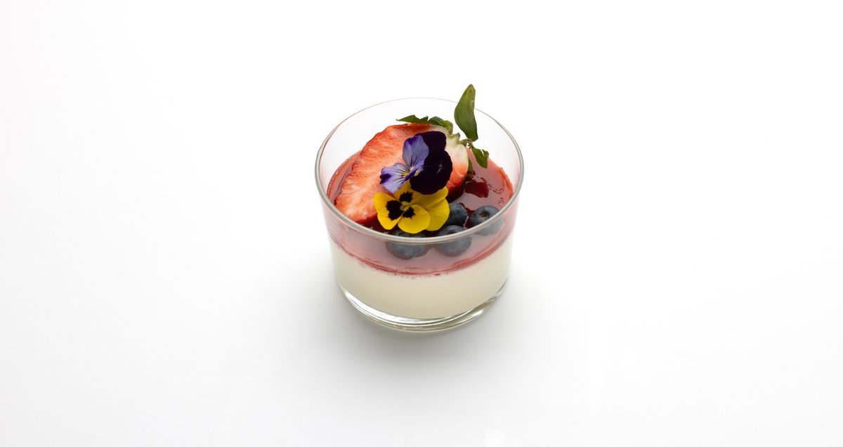 Täyteläinen ja pehmeä pannacotta, jossa vadelmien raikas maku tuo ihanan kontrastin kermaiseen koostumukseen. (L, G)