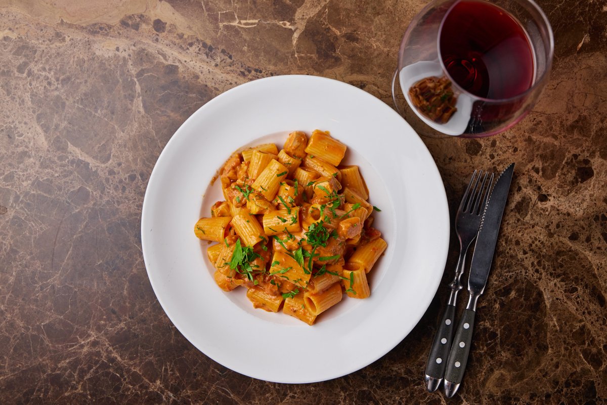 mezzi rigatoni pastaa kermaisessa tomaattikastikkeessa, jossa on valkosipulia, chiliä, pecorinoa, Grana Padanoa ja munankeltuaista, sekä salsicciaa ja guancialea