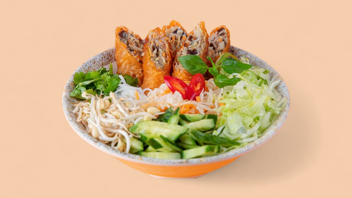 Bun Cha kevätkääryleillä Vermicelli-nuudelit, rapea iceberg-salaatti, kurkku ja vietnamilaistyyliset pikkelit luovat raikkaan pohjan tälle herkulliselle annokselle. Kevätkääryleet, valittavissa liha- tai vegerullat, täyttävät makunystyrät tuoreilla aromeilla. Korianteri tuo annokseen raikasta yrttisyyttä, ja cuoc cham -kastike täydentää makuelämyksen tasapainoisella makeudellaan ja suolaisuudellaan. Viihtyisä ja maukas vietnamilainen ateria!