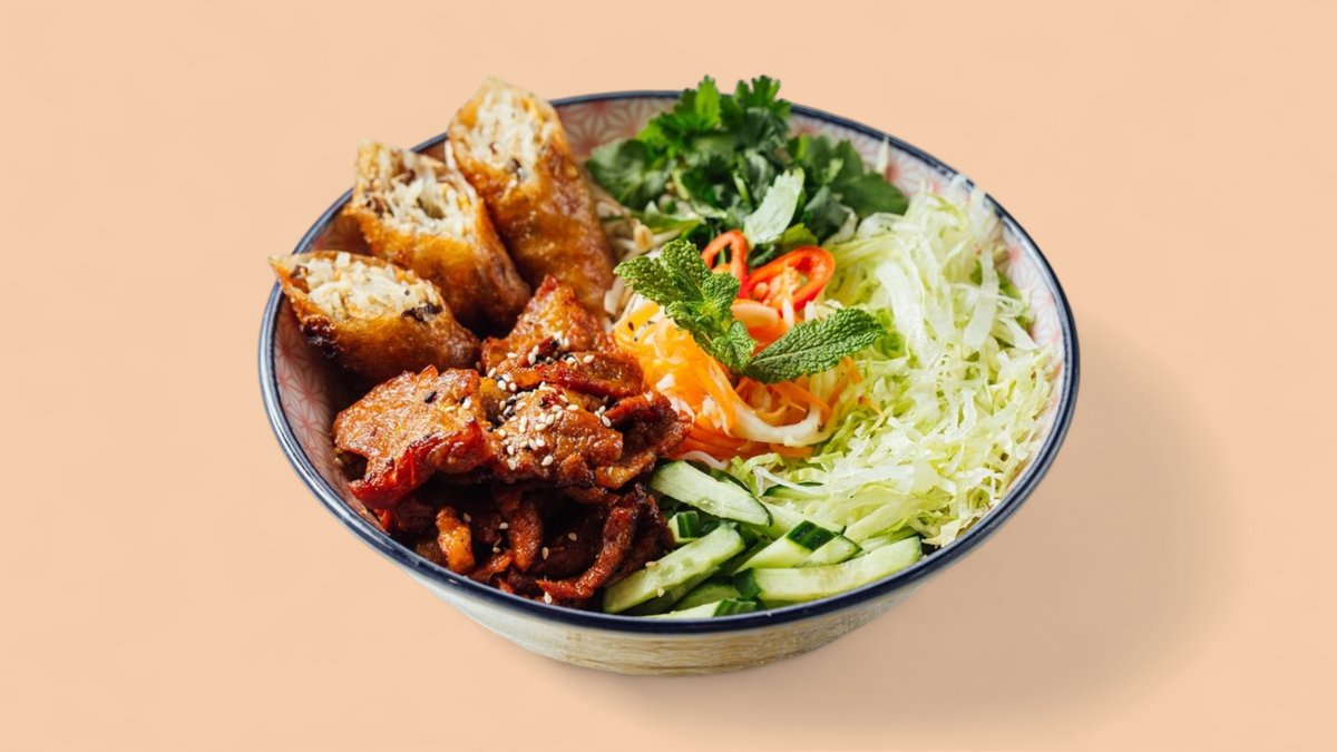 Bun Cha grillatulla possulla sekä kevätkääryleillä Vermicelli-nuudelit, rapea iceberg-salaatti, kurkku, vietnamilaistyyliset pikkelit sekä korianteri luovat herkullisen pohjan. Grillattu porsaanliha sekä kevätrulla tuo annokseen täyteläistä makua. Cuoc cham -kastike yhdistää kaikki maut täydellisesti, tasapainottaen makeuden ja suolaisuuden. Aito ja maukas vietnamilainen kokemus!