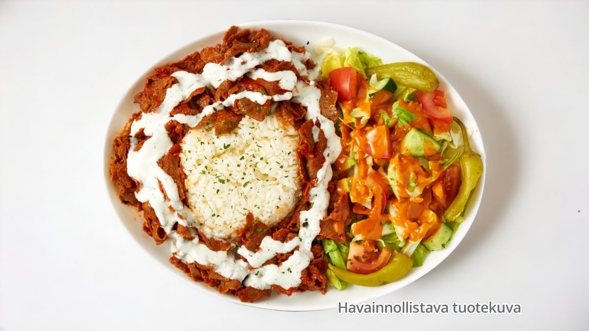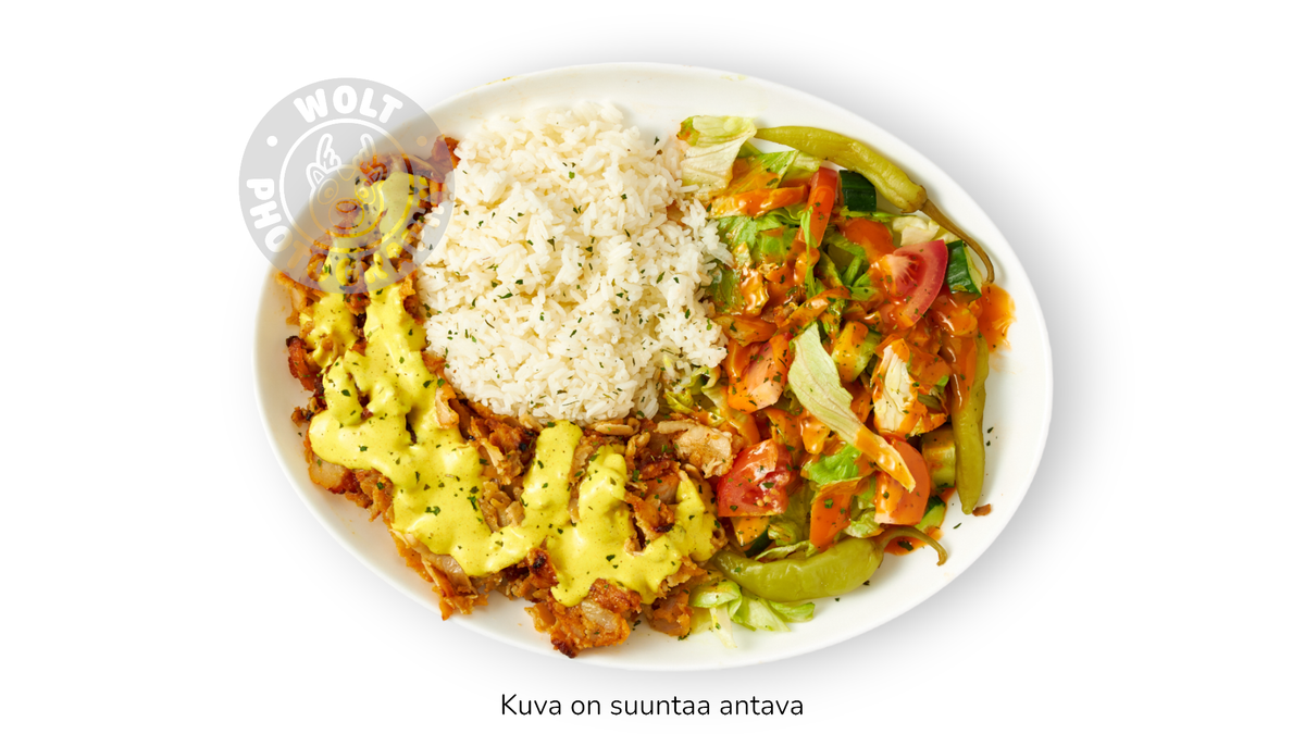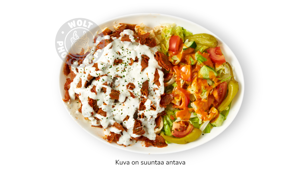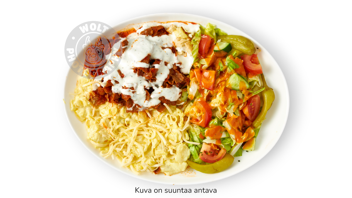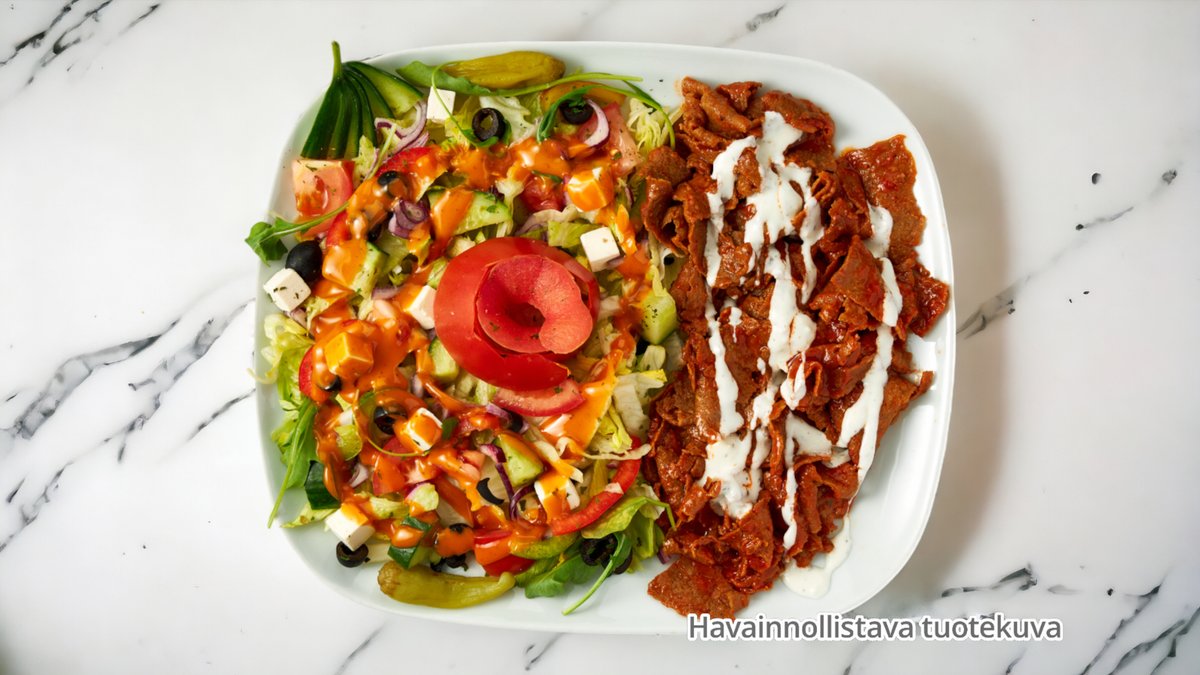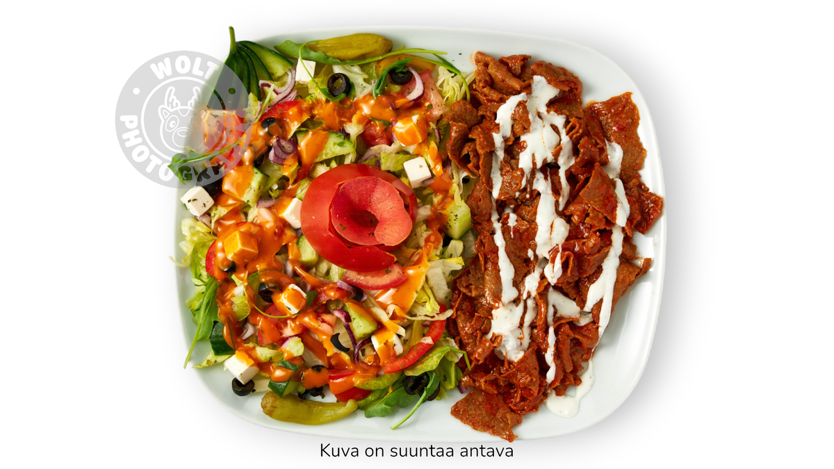 Vöner, runsas salaatti, tomaatti, kurkku, oliivi, sipuli, paprika, kastikkeet