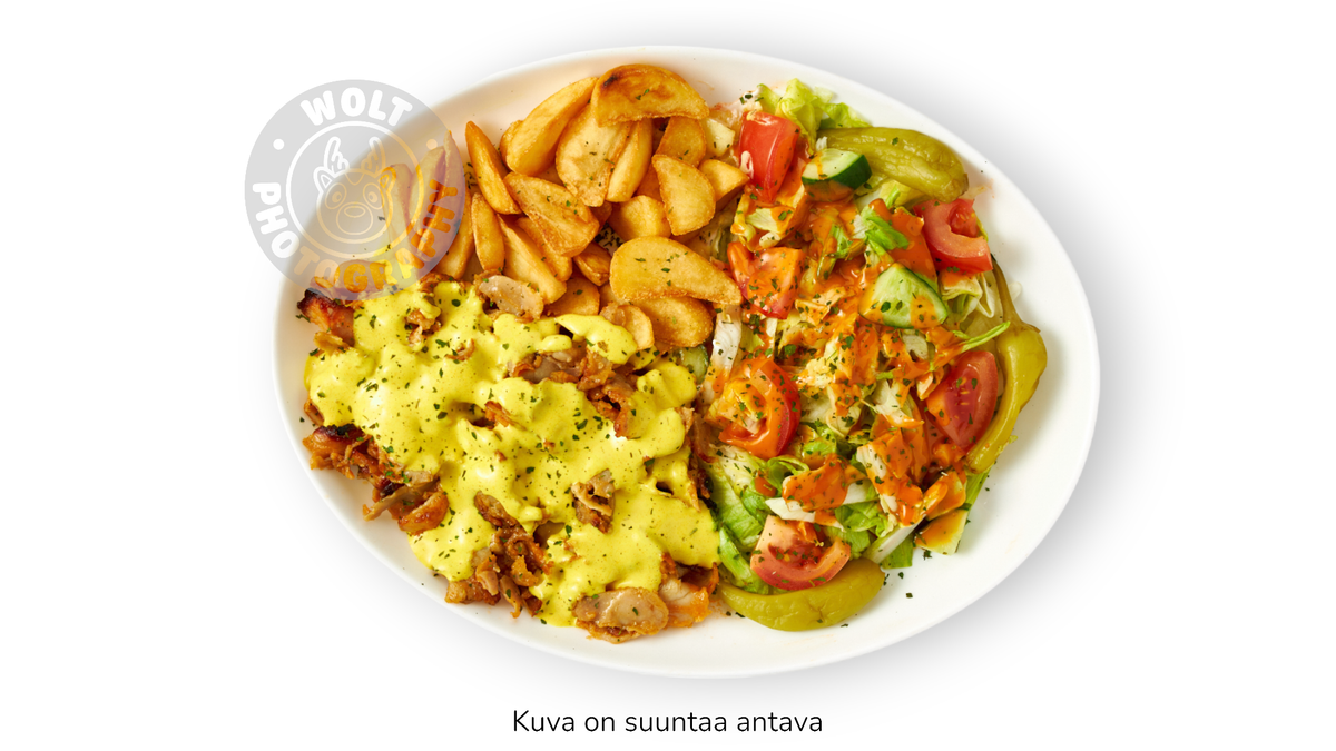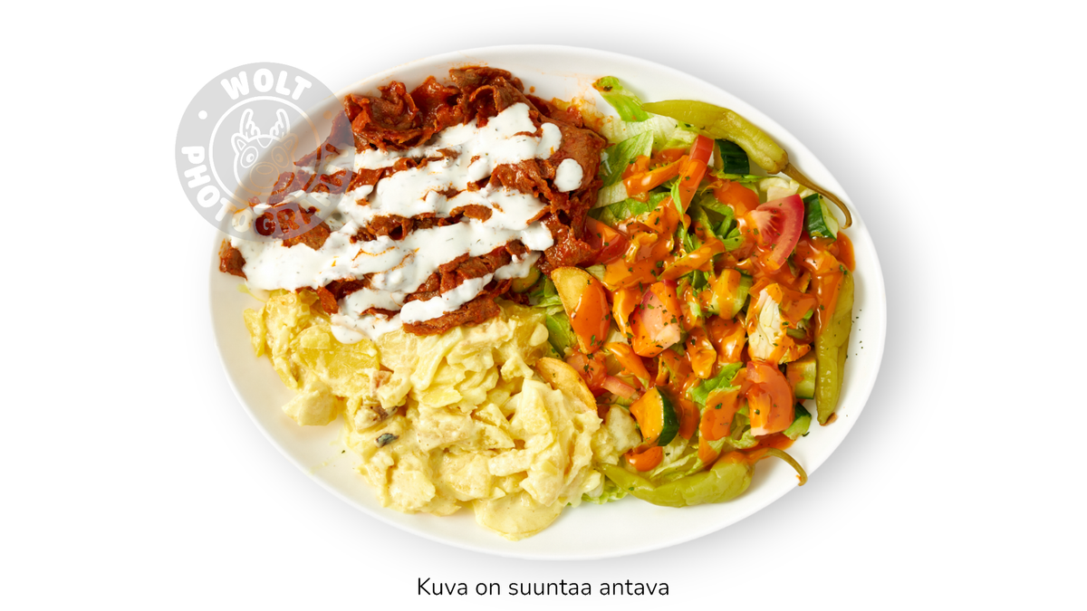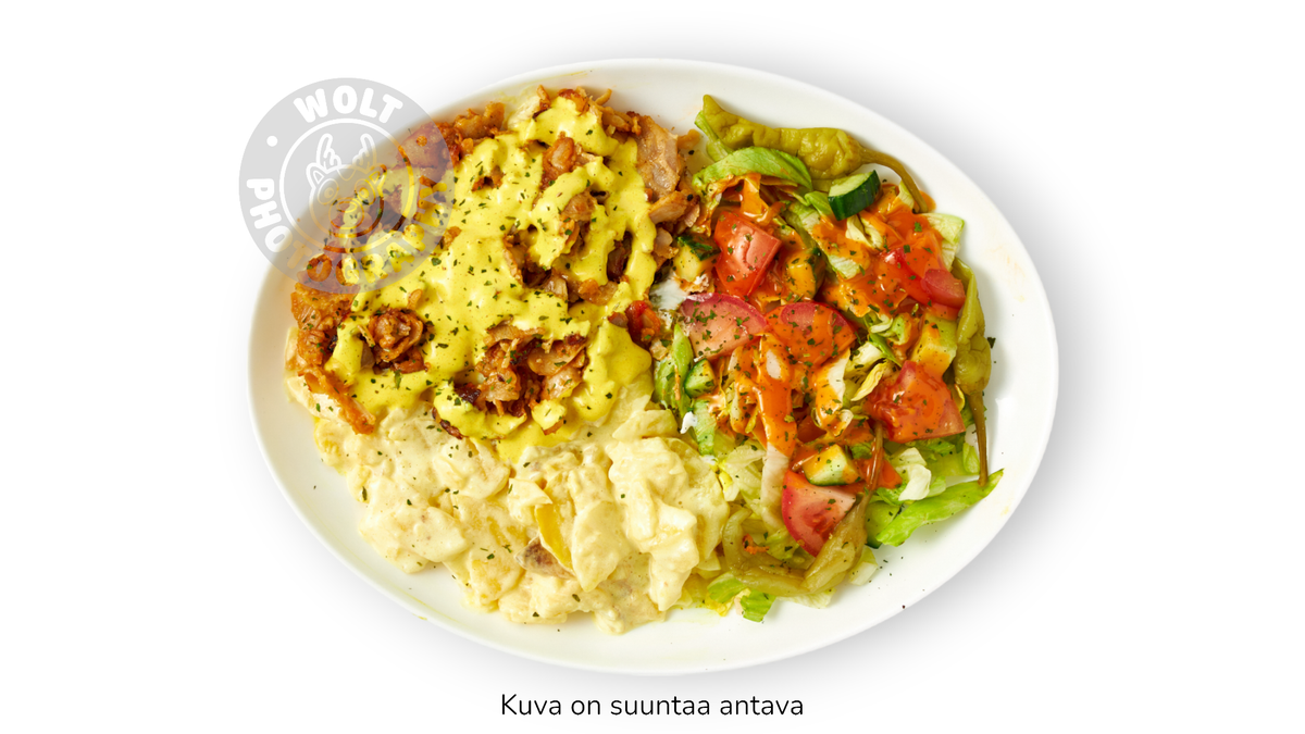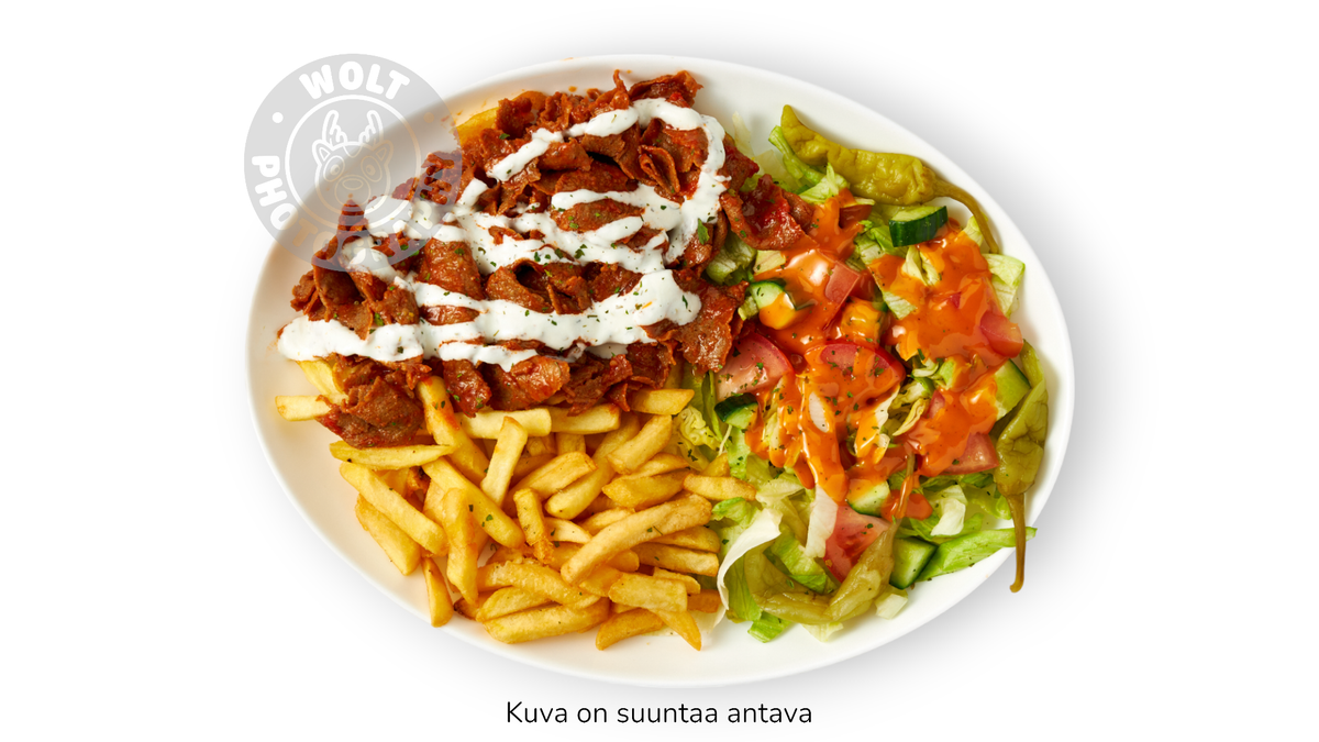 Vöner, salaatti, lohkoperunat, kastikkeet