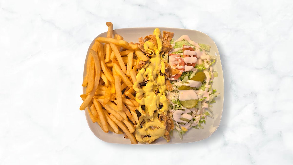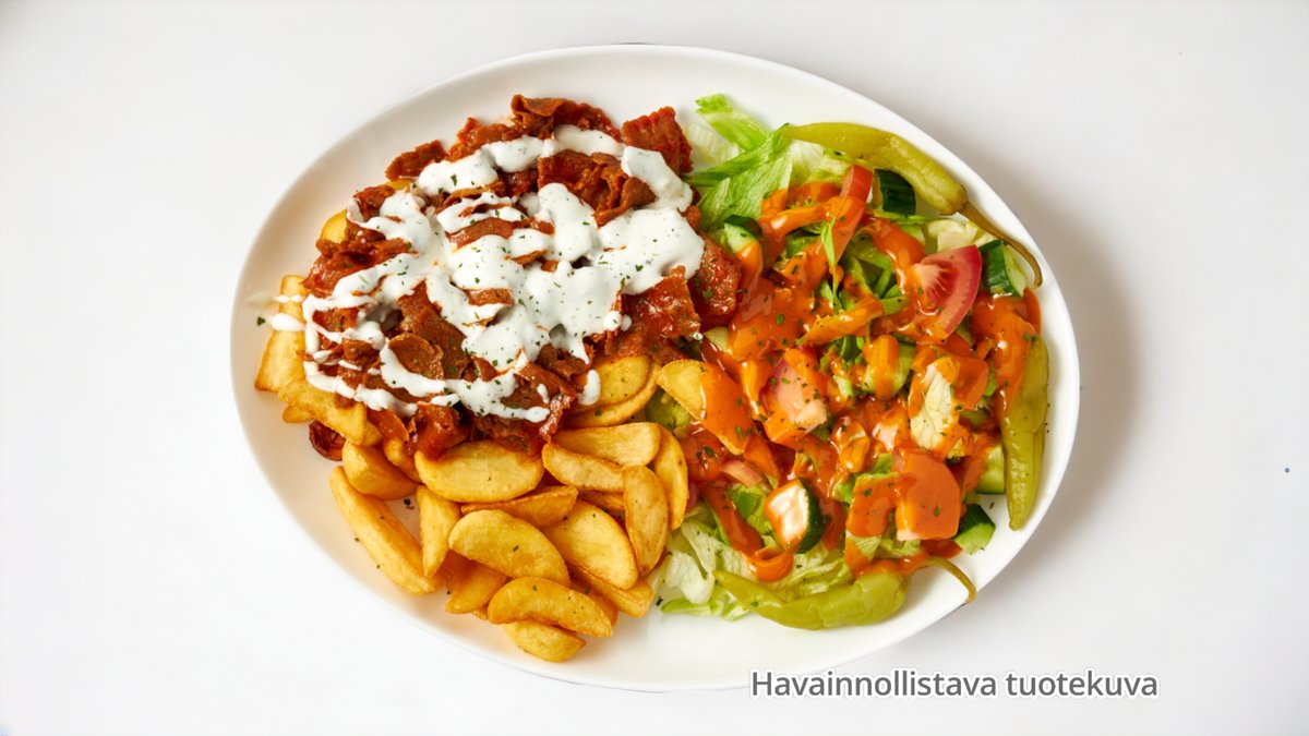 Vöner, salaatti, ranskalaiset, kastikkeet