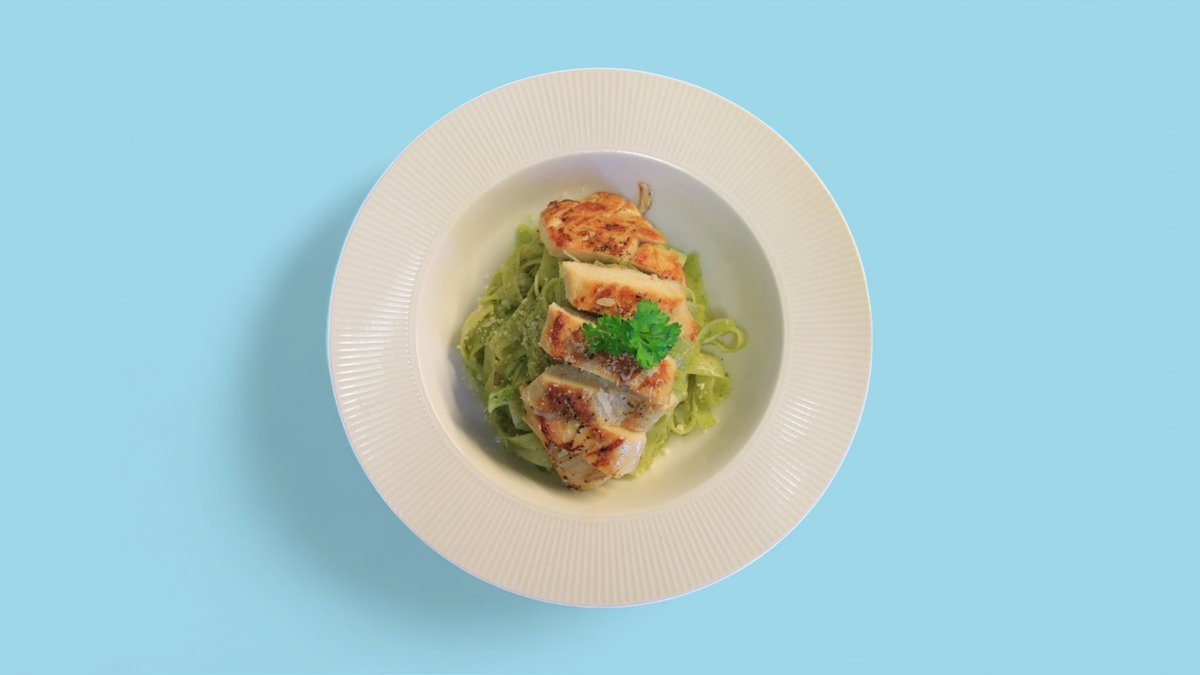 Pasta is coated in a fresh, flavorful sauce made from basil, garlic, mixed nuts, parmesan, and olive oil with grilled chicken.