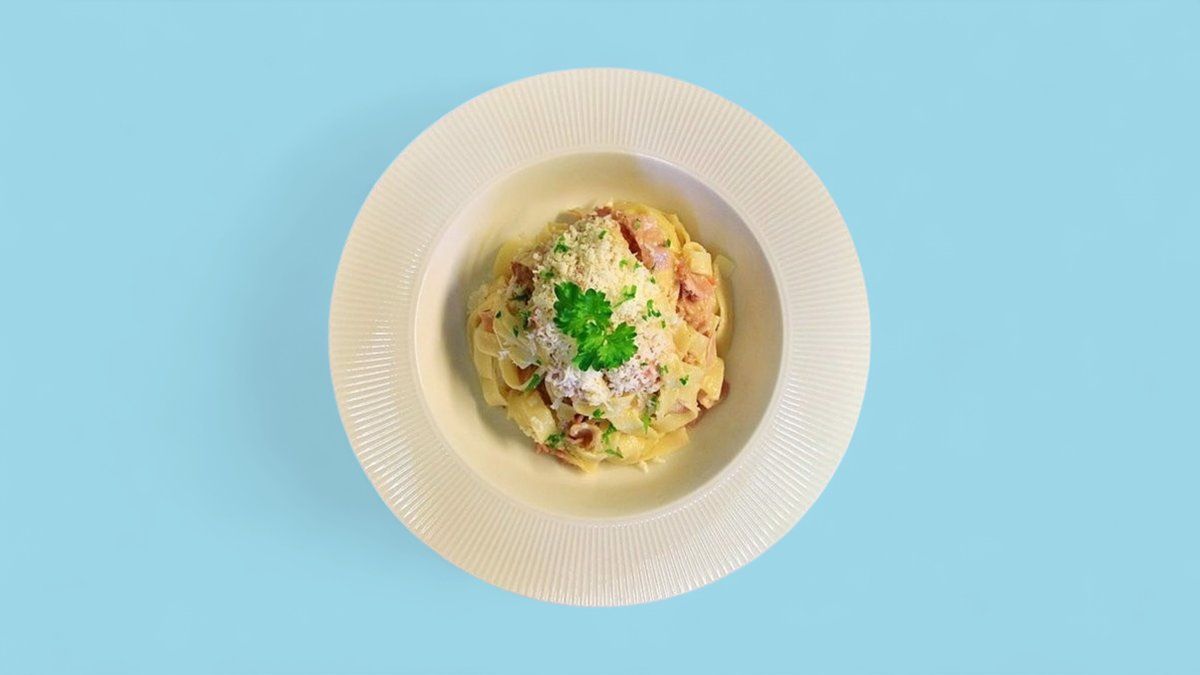 Pasta is made with eggs, cheese, ham, bacon and black pepper, creating a rich and flavorful sauce.