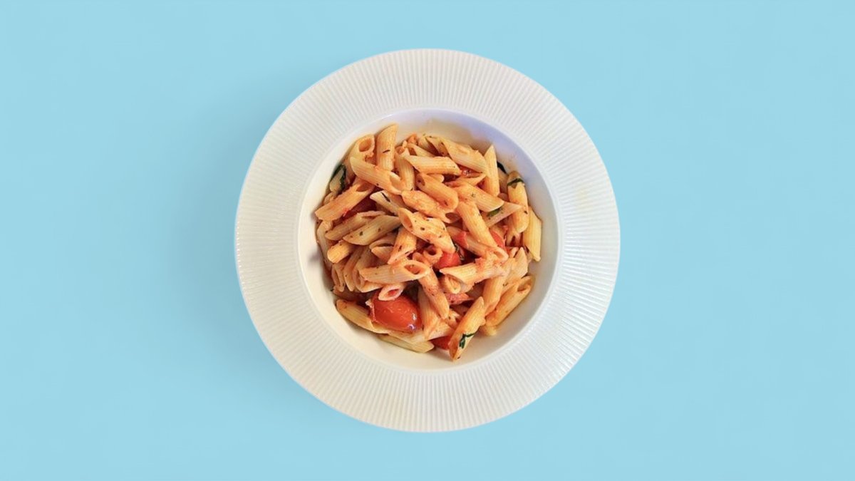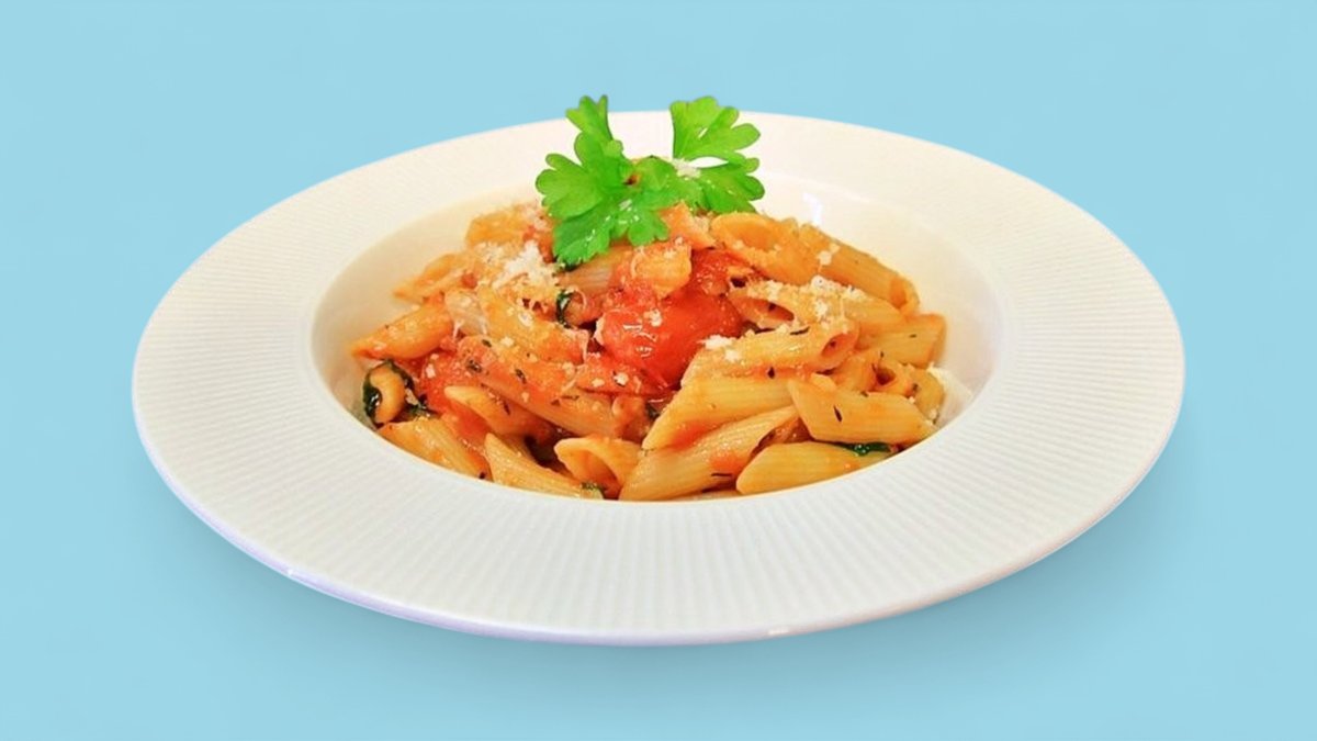Spicy dish featuring pasta tossed in a fiery tomato sauce infused with garlic, chili peppers, and a hint of olive oil for a vibrant kick.