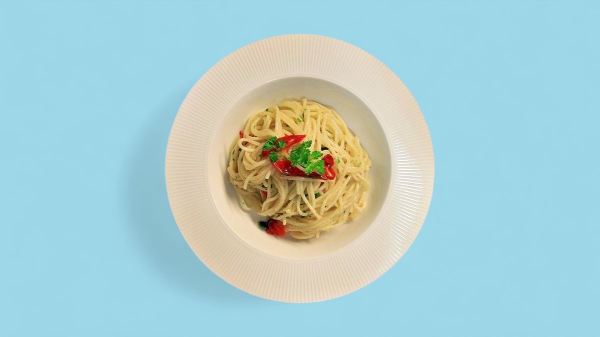 Pasta is cooked together with garlic, dried chilli, basil, seasonings in olive oil and topped with Grilled Chicken.