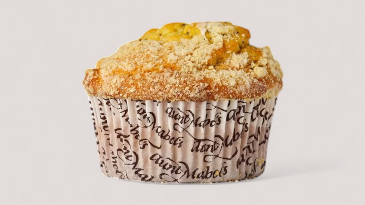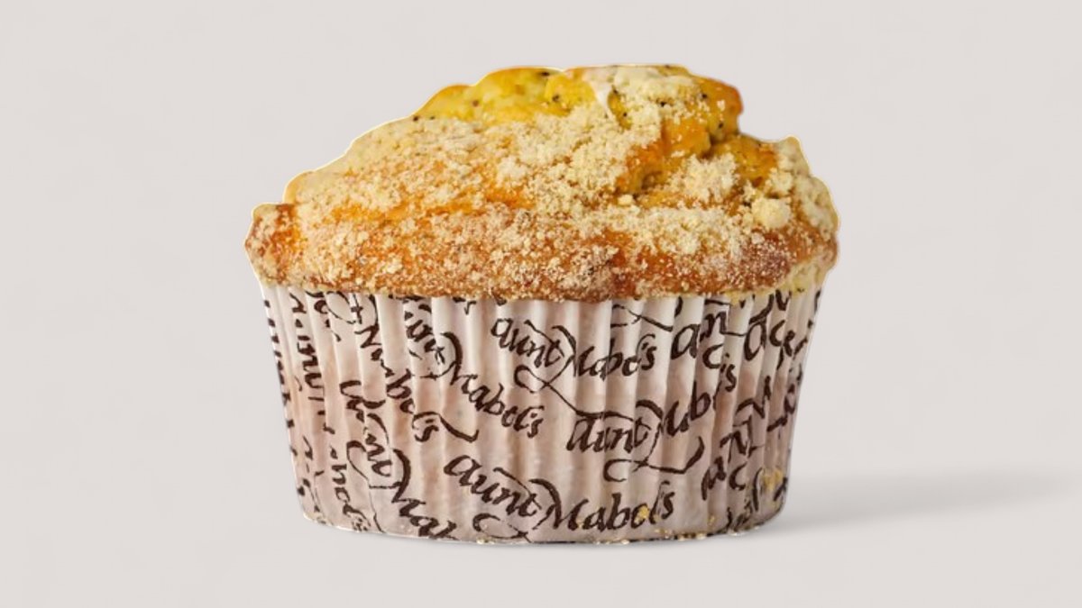 Ihanan raikas sitruunainen muffinssi unikonsiemenillä, joka kätkee sisäänsä tuorejuustokreemin.