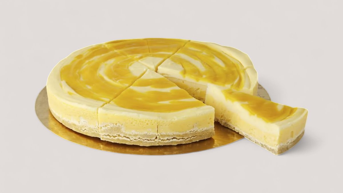 Rapean keksipohjan päällä raikasta sitruunajuustokakkua. Päällä raikasta lemon curd-tahnaa. Kakku on leikattu valmiiksi 12 palaan.