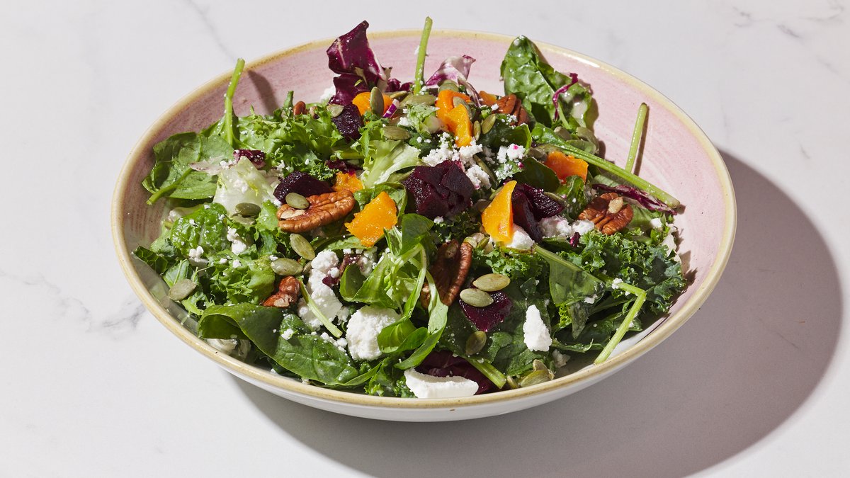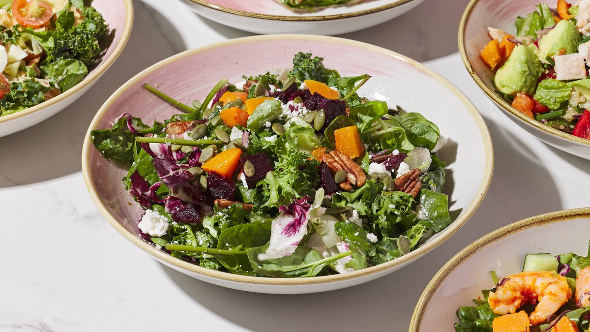 Vuohenjuusto + Pekaani + Punajuuri (G, L, sis. pähkinää) Provencal-salaattia, lehtikaalia, baby pinaattia, pehmeää vuohenjuustoa, paahdettua myskikurpitsaa, paahdettua punajuurta, päärynää, pekaanipähkinää, kurpitsansiemeniä ja pekaanipähkinä-vinegretteä. kcal 563 | prot 17 | carb 11 | fat 49