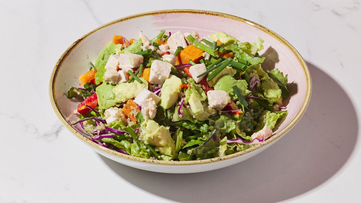 Avokado + Kananrinta + Chili + Lime (G, M) Roomansalaattia, kotimaista kananrintaa, punakaalia, paprikaa, paahdettua bataattia, umami kvinoaa, avokadoa, ruohosipulia, chilirachaa ja täyteläistä limedressingiä. kcal 714 | prot 31 | carb 37 | fat 46