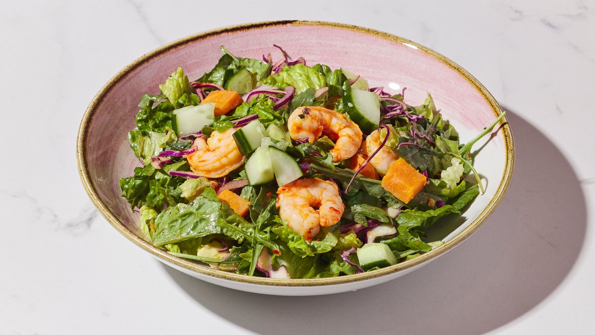 Avokado + Tiikerirapu + Chili Roomansalaattia, rucolaa, chilipaahdettuja tiikerirapuja, avokadoa, chilipaahdettua bataattia, kurkkua, punakaalia, punasipulia, limen mehua, Chilirachaa, limedressingiä ja täyteläistä seesami-inkivääri vinaigretteä. kcal 744 | prot 19 | carb 68 | fat 43