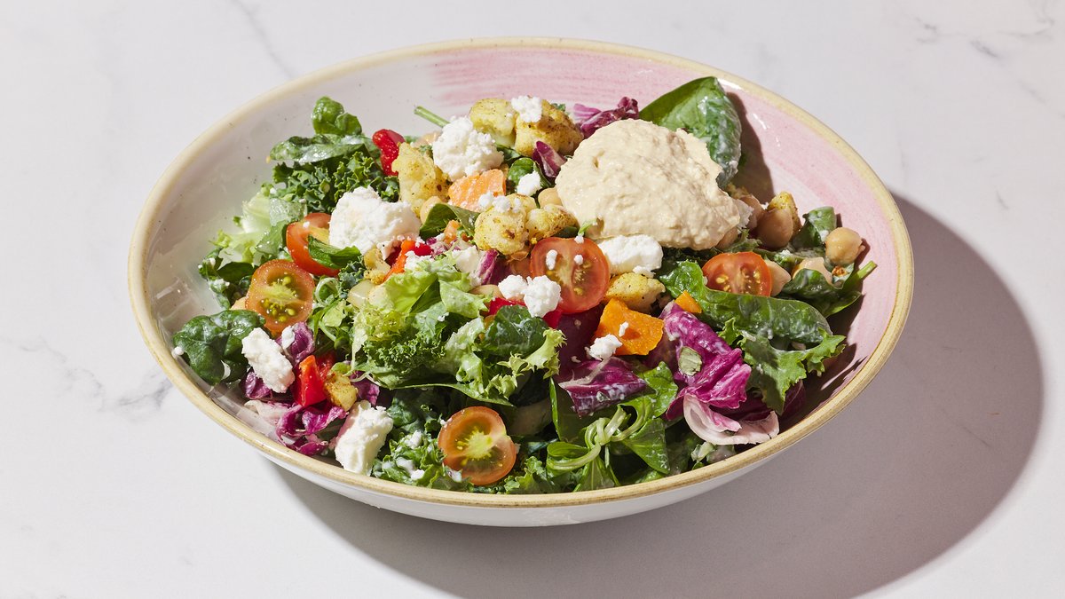Ras El Hanout + Kukkakaali + Feta + Bataatti (G, L) Lehtikaalia, pinaattia, Provencal-salaattia, Ras el Hanout -paahdettua kukkakaalia, bataattia, fetajuustoa, valkosipulimarinoituja kikherneitä, kirsikkatomaattia, paprikaa, hummusta ja pehmeää kurkku-jugurttikastiketta kcal 375 | prot 19 | carb 24 | fat 19