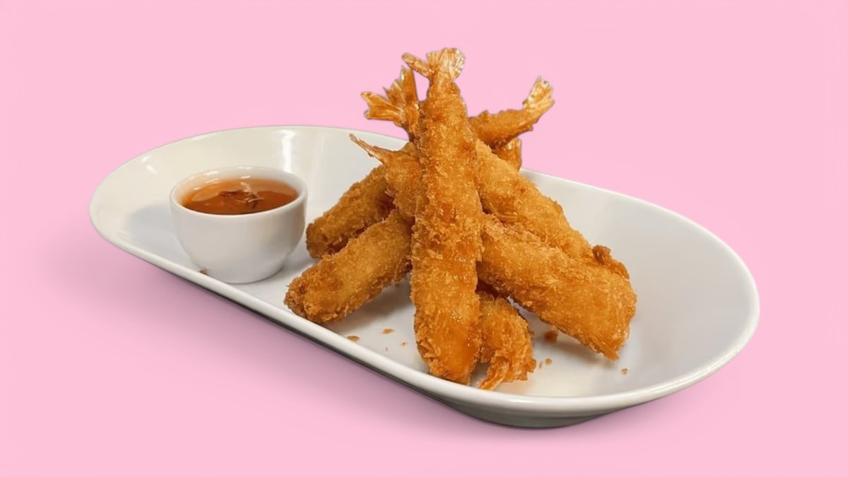 6 Pcs of Deep fried battered shrimps with a dipping sauce.