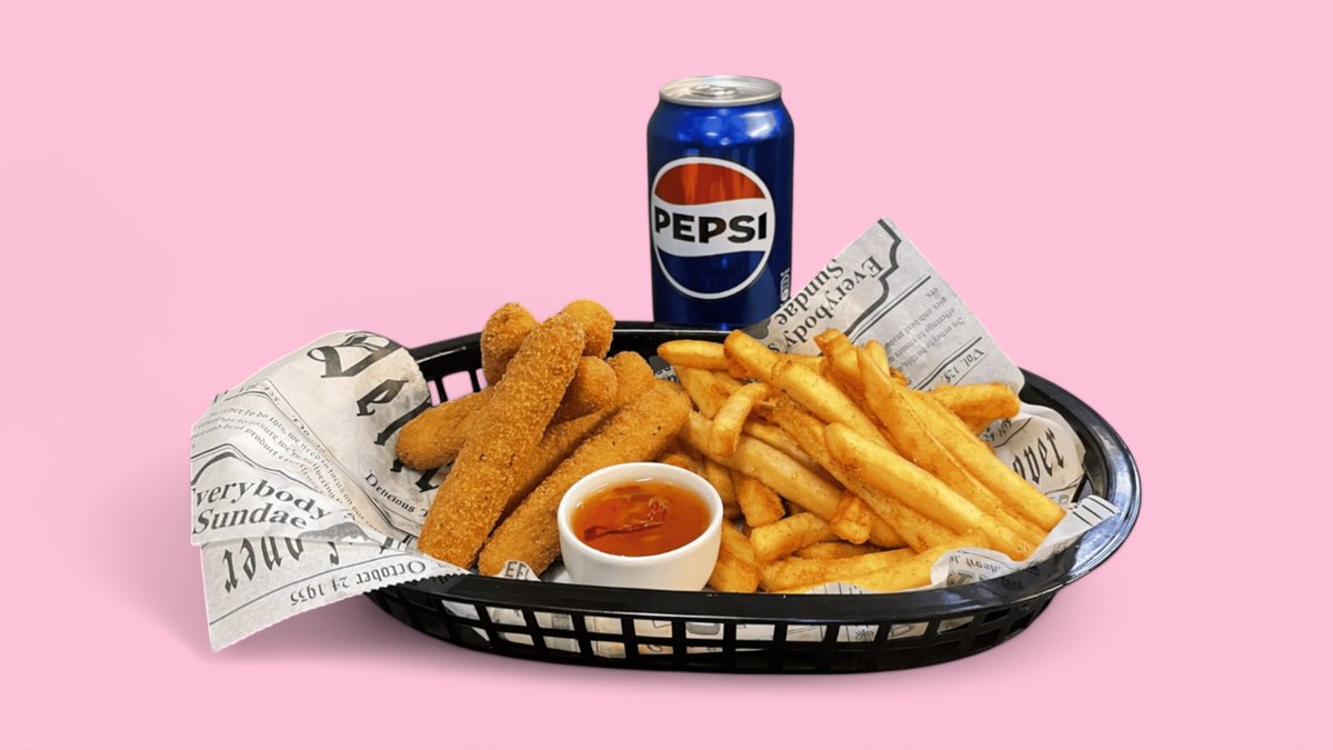 6 Mozarella cheese sticks with dippi of your choice, french fries and a soft drink 0,33L.