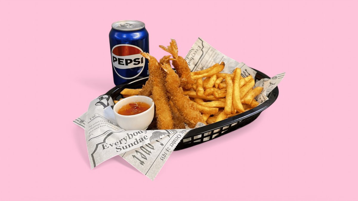 6 Pcs of Deep fried battered shrimps with a dipping sauce + french fries + a soft drink(0,33L).