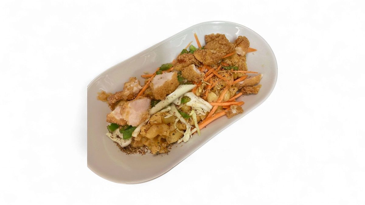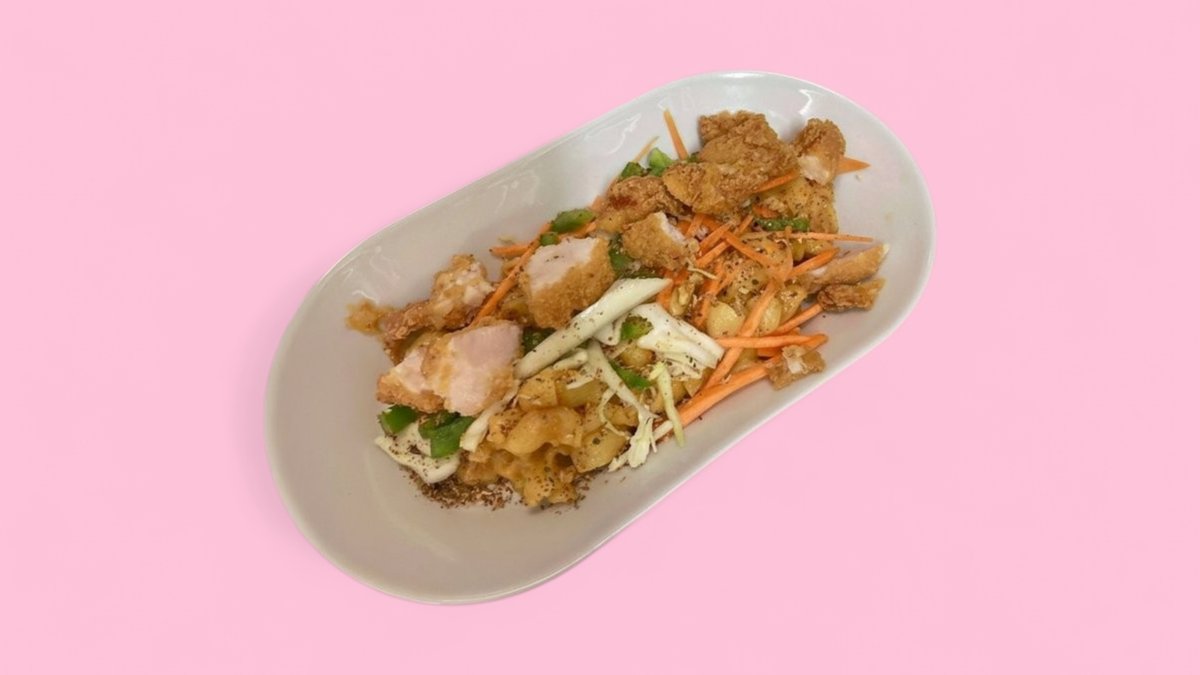 Featuring our new menu creation , Mac n cheese filled with veges of your choice and topped with cRispy southern fried chicken.