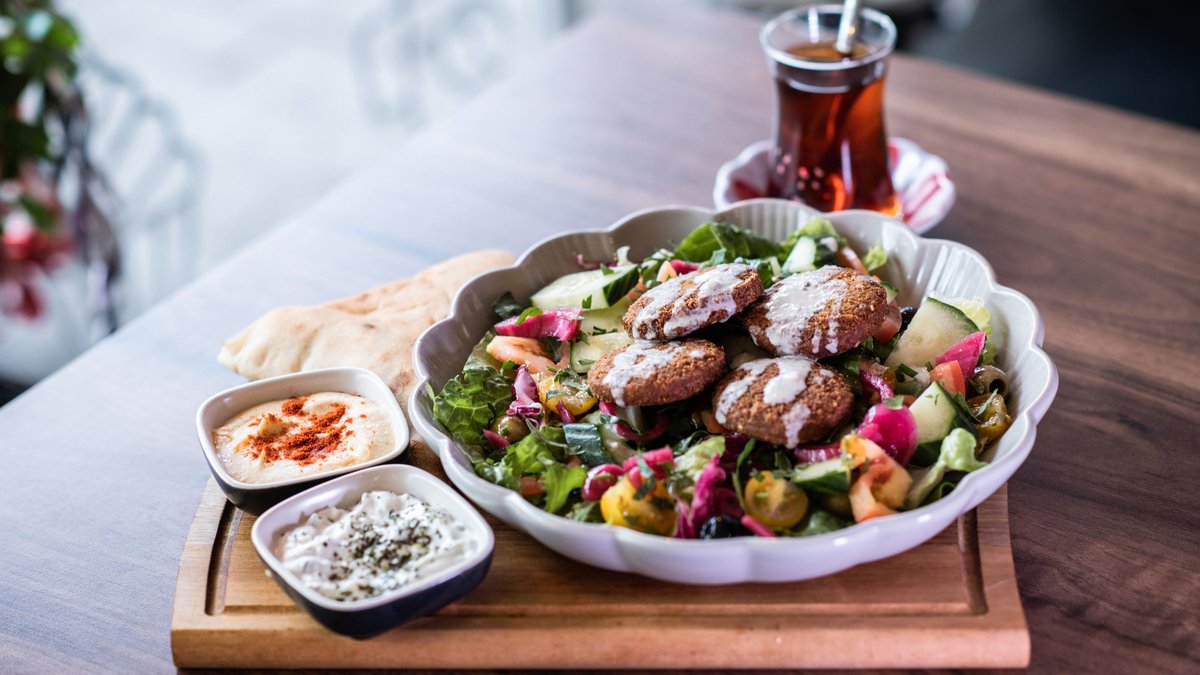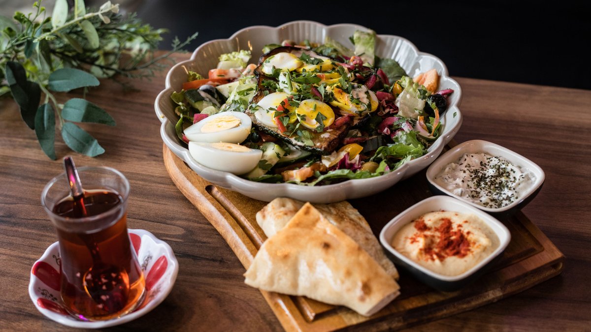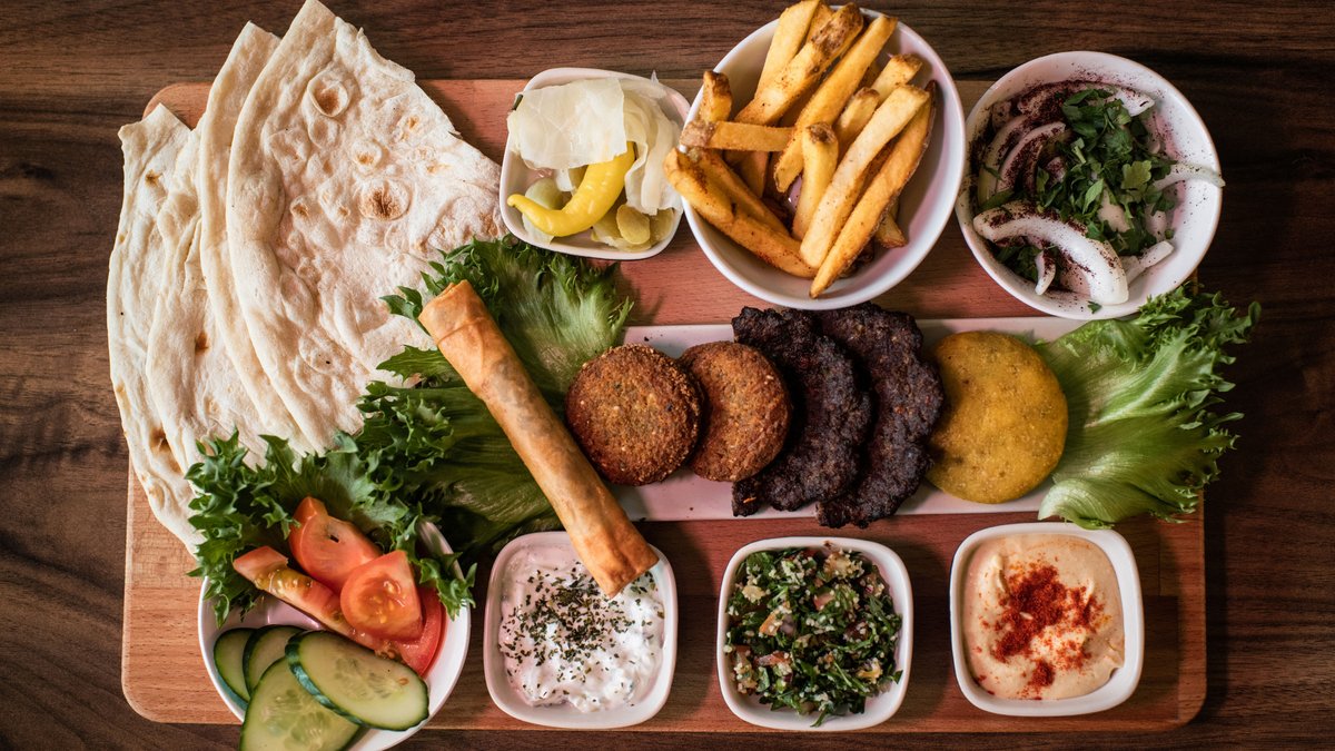 Erilaiset salaatit, kubba, börek, kebab, falafel (annokseen kuuluu leipä ja kahvi tai teetä)
