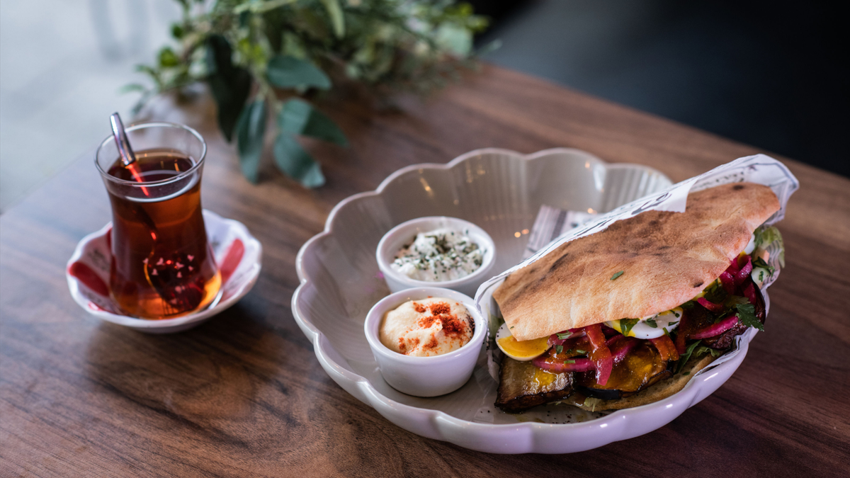 Pita, salaatti, kurkku, tomaatti, hummustahna, kebab, paistettu munakoiso, paistettu kesäkurpitsa