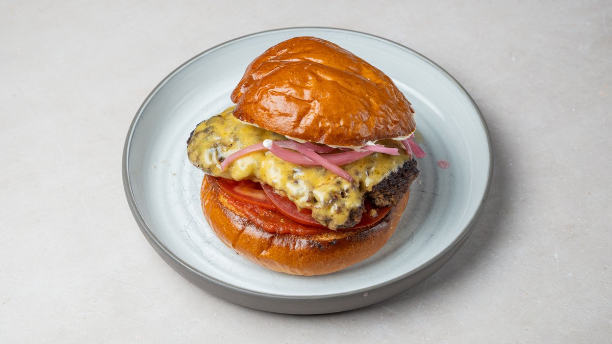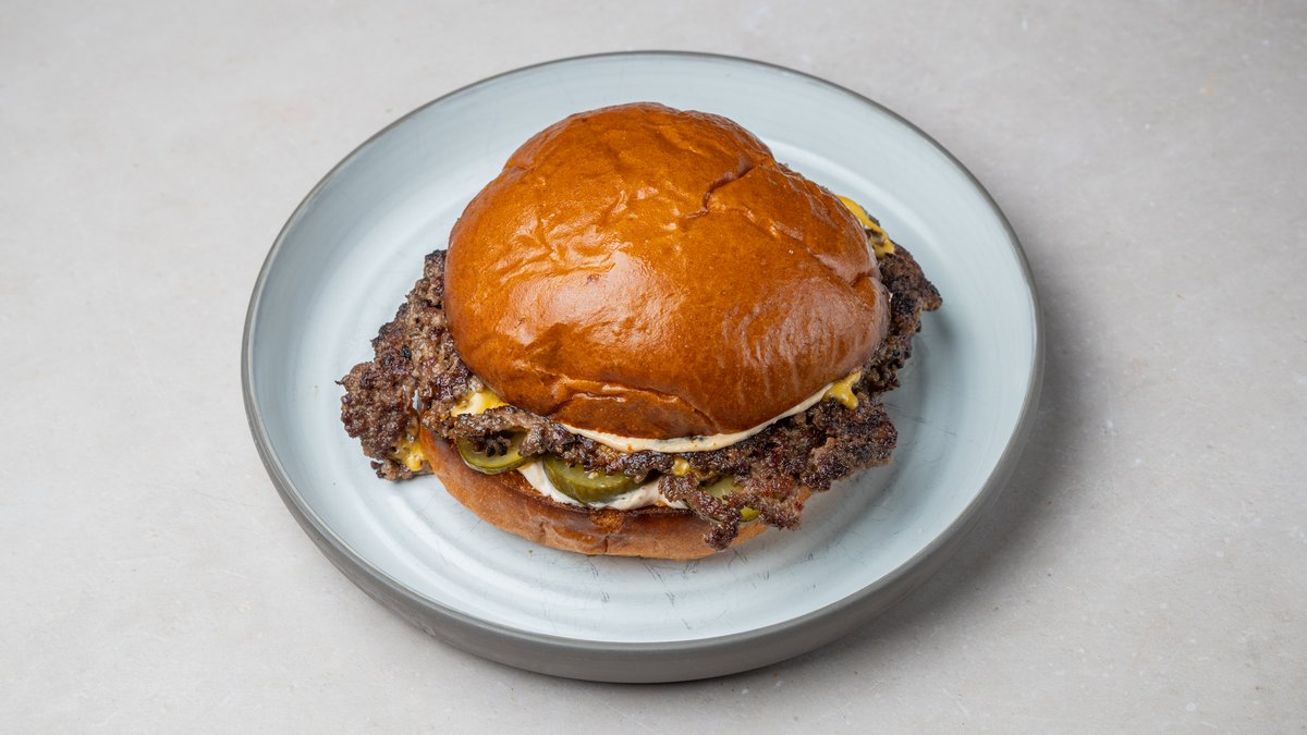 2 x 80g kotimainen rotukarjan jauhelihapihvi, Amerikan cheddaria, maustekurkkua ja lime-chilimajoneesia. Saatavilla myös kasvisversiona.