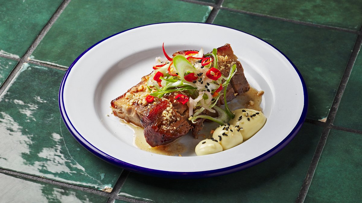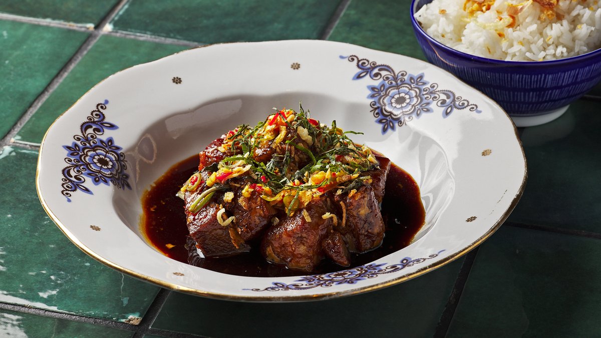 Crispy pork neck, palm sugar caramel gravy, thai basil, chili, jasmine rice