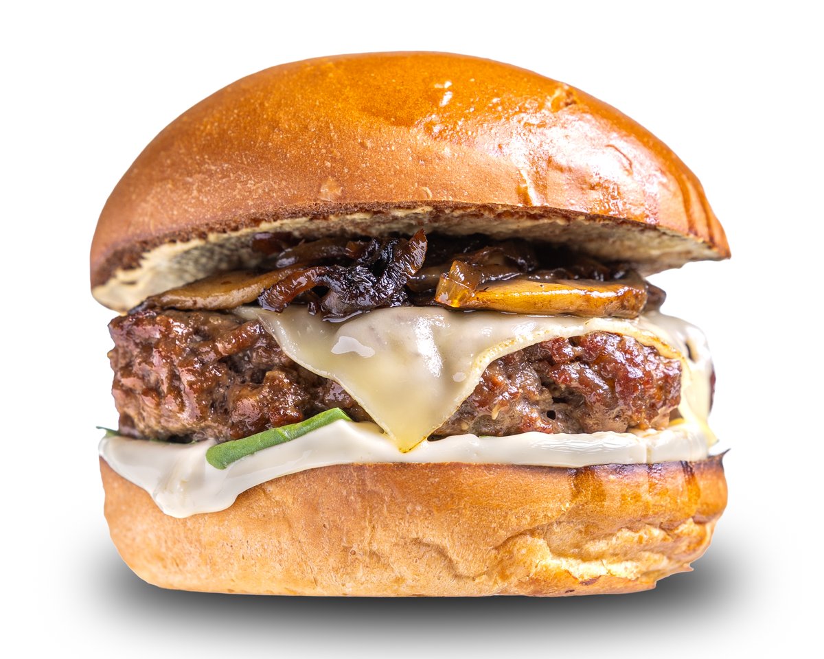 Perunasämpylä, tryffelimajoneesi, rucola, kaksi 100 % kotimaista naudanlihapihviä, emmental- juusto, sipuli- herkkusienipaistos, Dijon- sinappi.