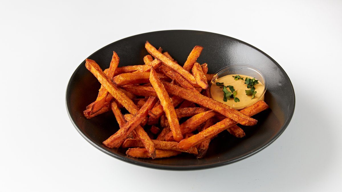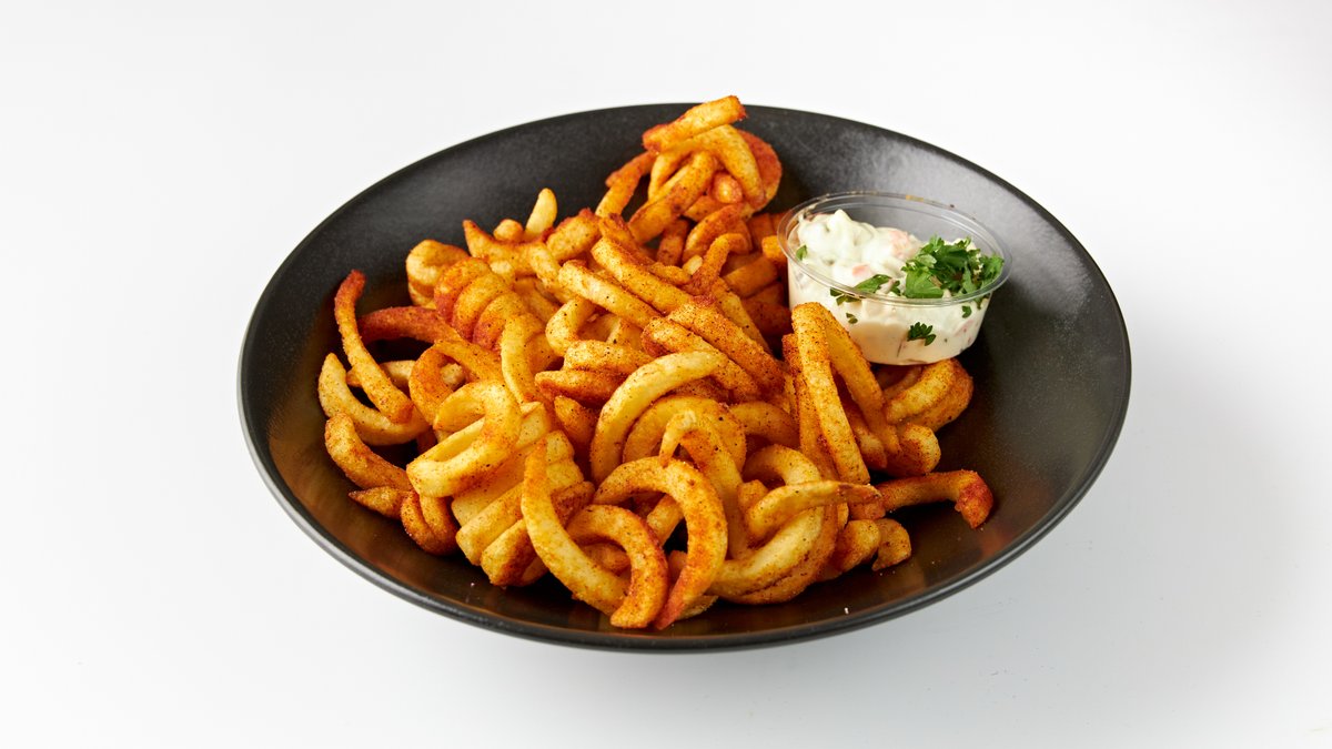 Pippurisekoituksella kuorrutettuja ranskalaisia chipotle-dipin kanssa tarjoiltuna
