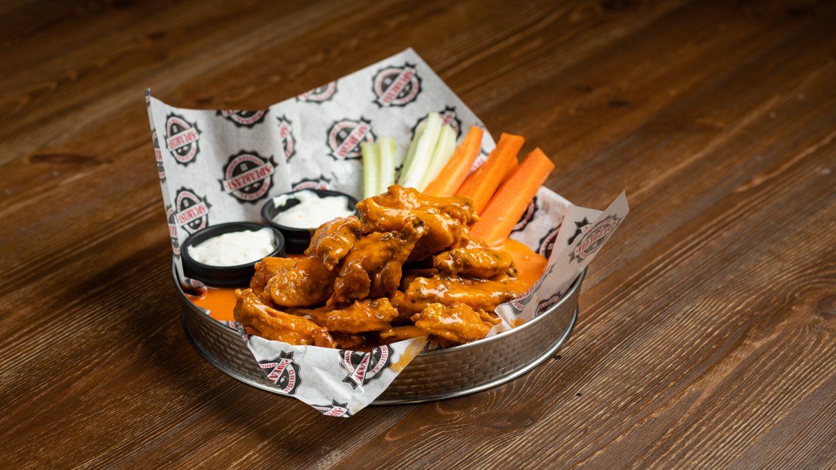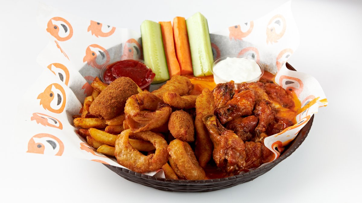 10 kpl wingsejä haluamallasi kastikevahvuudella 2 kpl friteerattuja juustotäytteisiä jalapenoja 3 kpl olutpaneroituja sipulirenkaita 3 kpl friteerattuja broilerinfileitä tikkuperunoita kasvistikkuja aurajuustodippiä sekä pippuriketsuppia