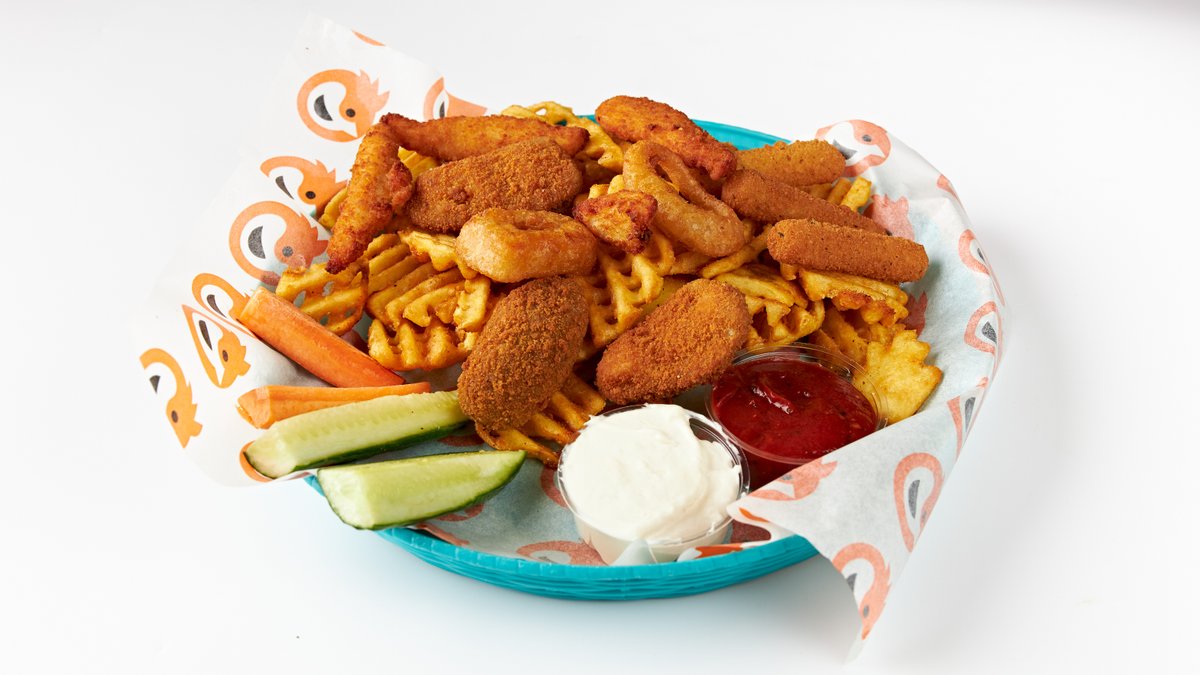2 kpl friteerattuja katkaravunpyrstöjä 2 kpl olutpaneroituja sipulirenkaita 2 kpl mozzarellatankoja 2 kpl friteerattuja juustotäytteisiä jalapenoja 2 kpl friteerattuja avokadolohkoja vohveliperunoita kasvistikkuja valkosipuli- ja aurajuustodippi