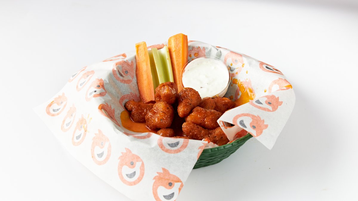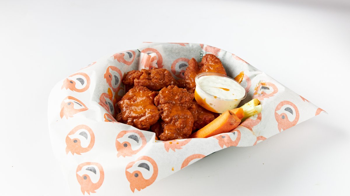 Friteerattuja broilerinfileitä (6 kpl tai 10 kpl) valitsemallasi Texas Pete-kastikkeella. Tarjoillaan tikkuperunoiden, kasvistikkujen sekä aurajuustodipin ja pippuriketsupin kanssa