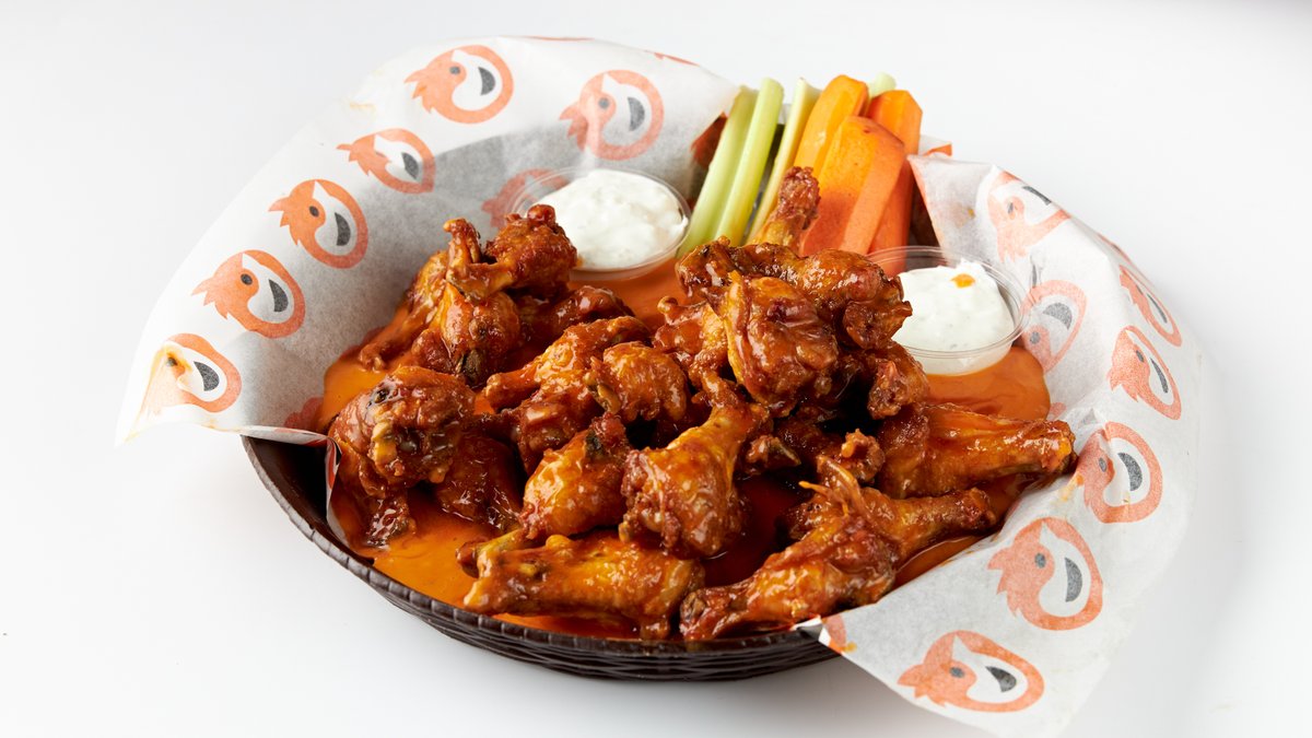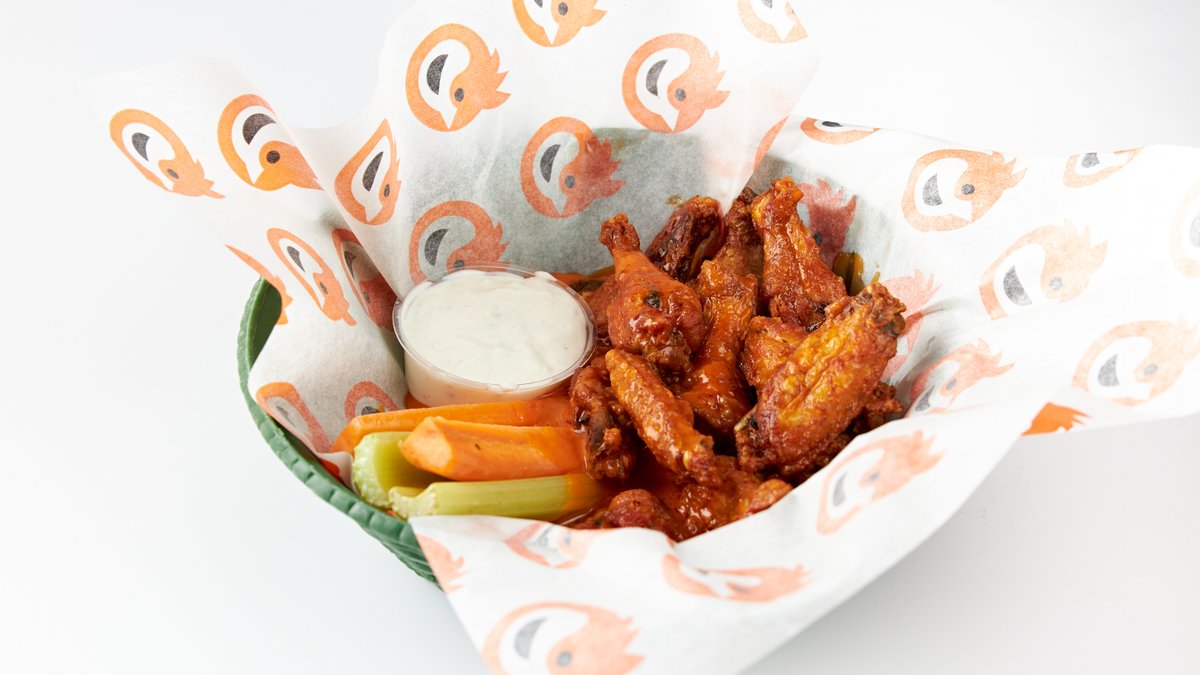 Kanansiivet tarjoillaan perinteiseen tapaan porkkanan, varsisellerin ja aurajuustodipin kanssa.