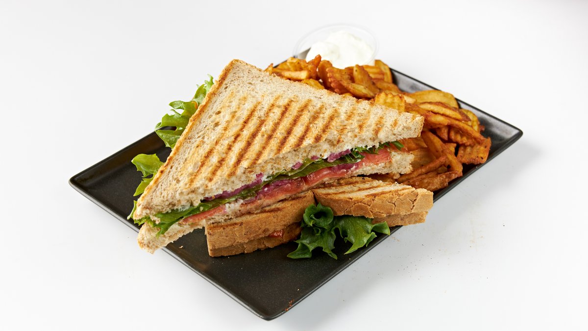 Rapeaksi paahdettu Foccaccia, täytteenä rapeaa salaattia, savupekonia, Texas Pete -majoneesia, tomaattia, sipulia ja bbq-kastiketta.