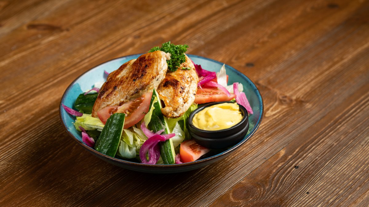 Salaattipedillä lämmintä broilerinfileetä, tomaattia, kurkkua, punasipulihilloketta sekä yrttiöljyä ja mangoraja. Broileri valintasi mukaan naturel tai paneroituna.