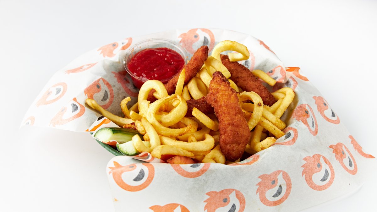 Paneroituja broilerin pikkufileitä, kierreperunoita, kasvistikkuja ja ketsuppia