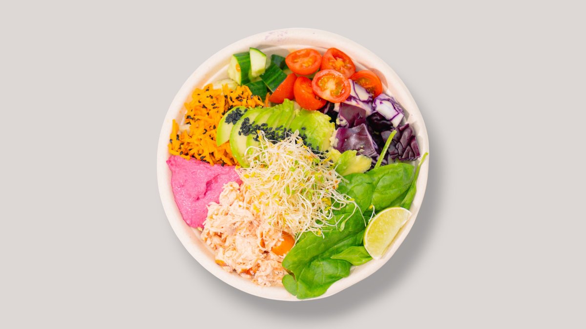 PROTEIINIA 41,5g, Hyvinvointivalmentaja Nanna Karalahden suunnittelemalla Super Hero lohikulholla voimaa ja hyvää oloa päivään! Sisältää: Kvinoa, lämminsavulohi, punajuurihummus, avokado, pinaatti. kirsikkatomaatti, punakaali, marinoitu porkkana, kurkku, salaatti, lime, idut Kastikkeena: Yrttiöljy