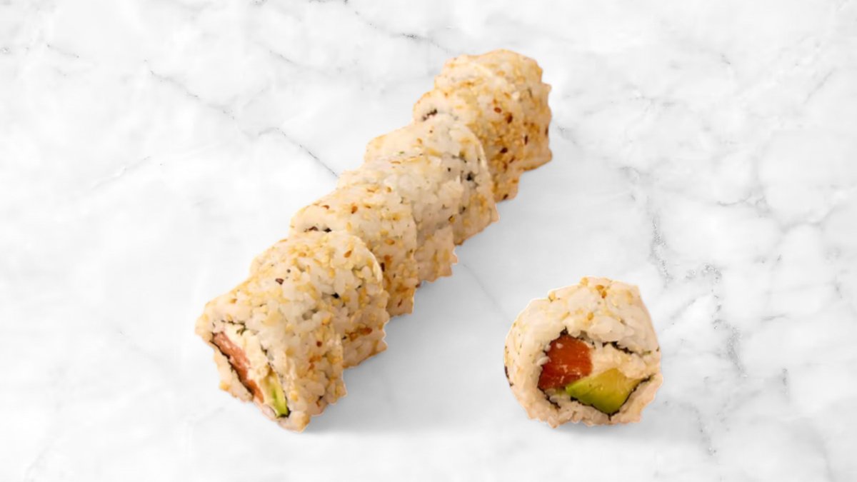 Lumirapu, avokado, japanilainen majoneesi, lohi, seesaminsiemenet.