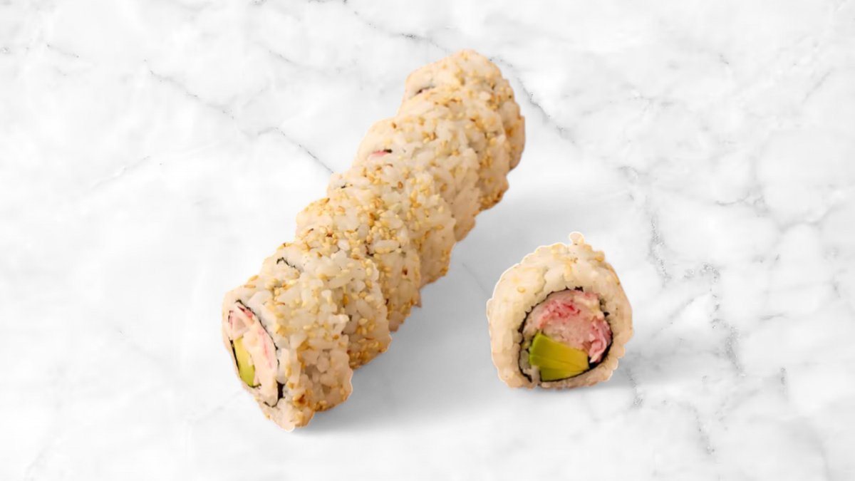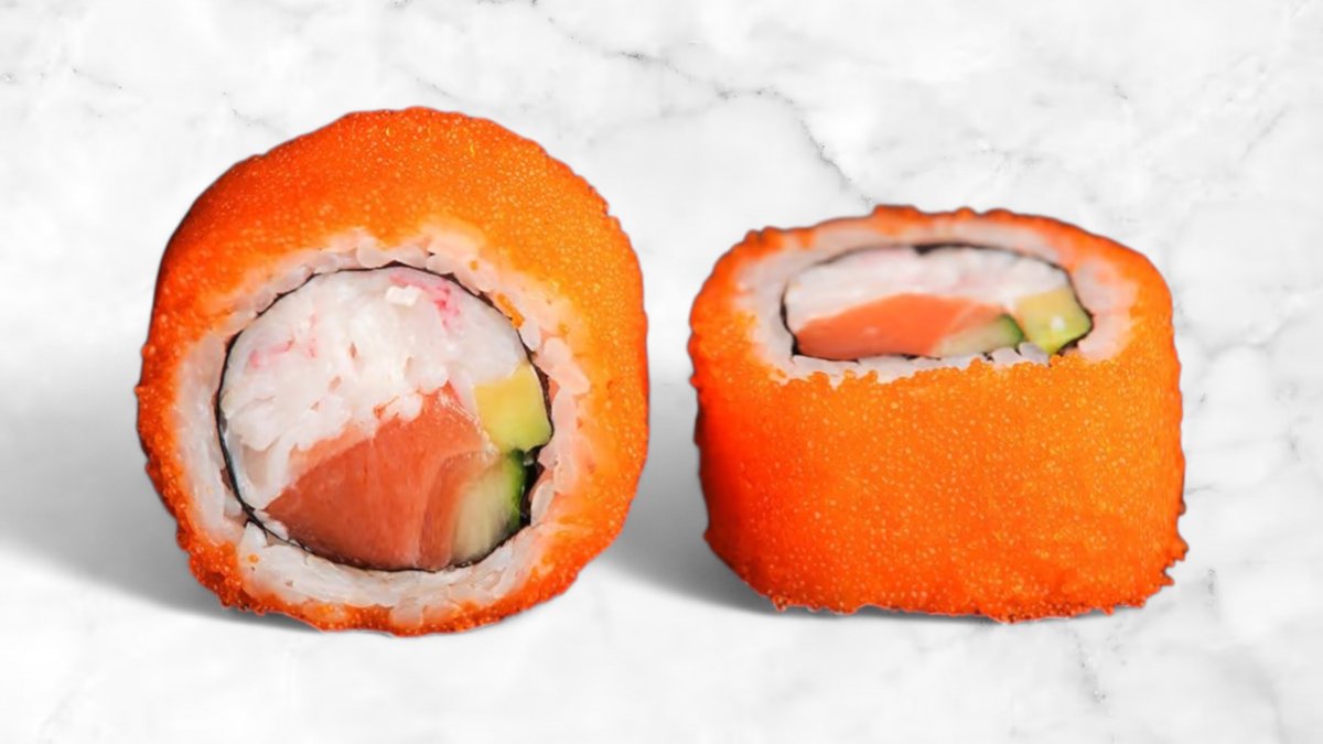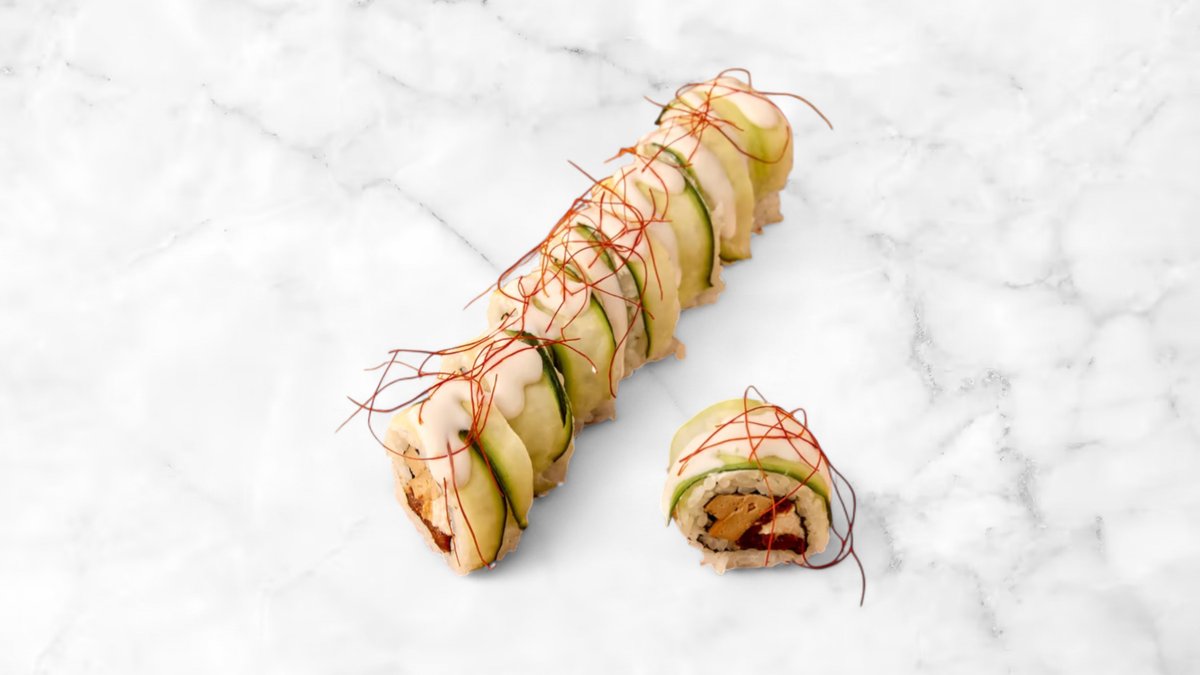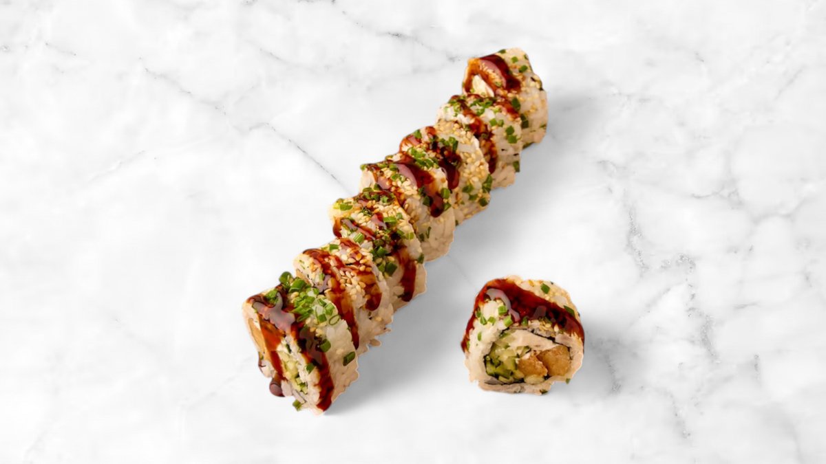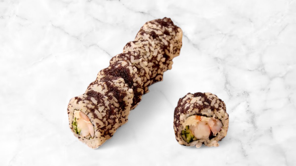 Uppopaistettu sushirulla, jättikatkaravunpyrstö, spicy porkkana, avokado, teriyakikastike, ruohosipuli.