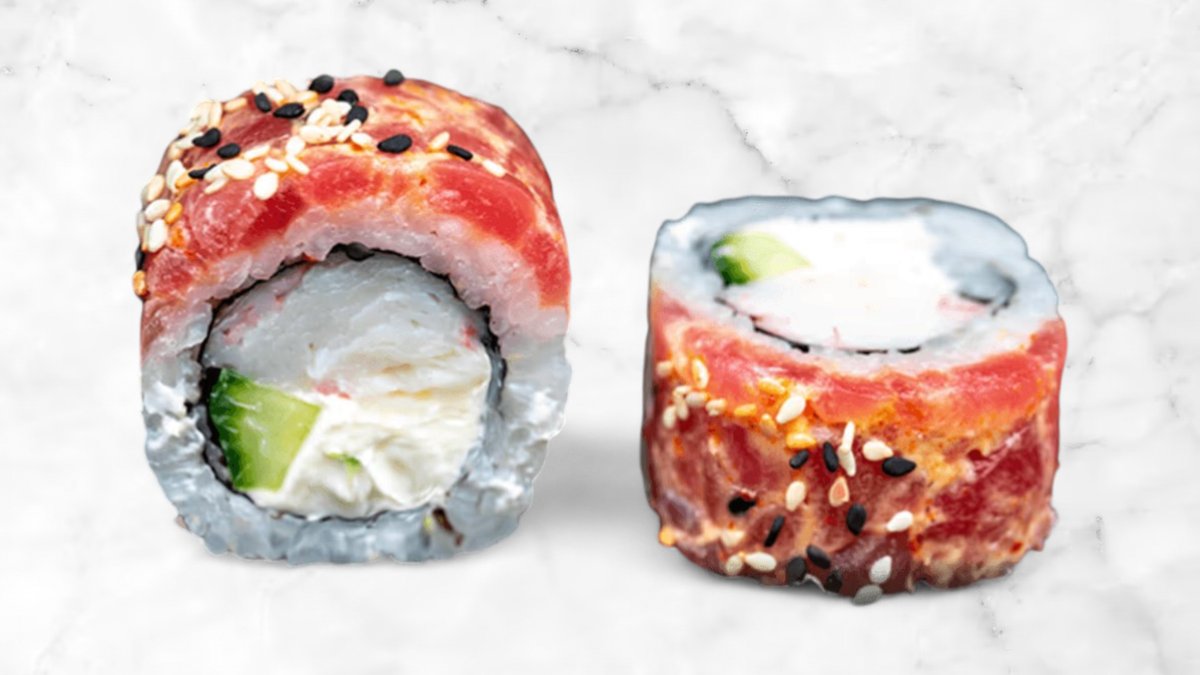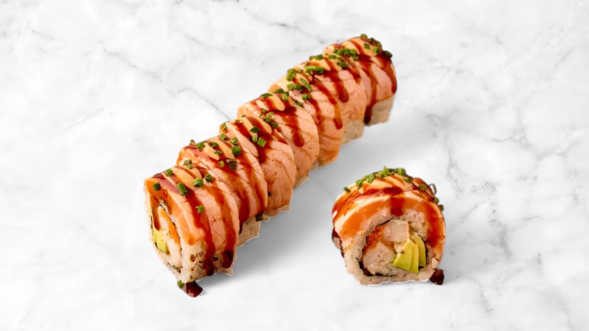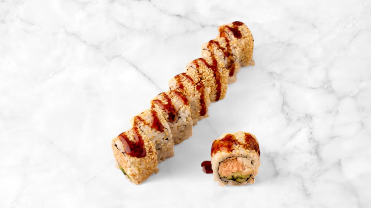 Uppopaistettu sushi-rulla, lohi, avokado, tuorejuusto, teriyakikastike.