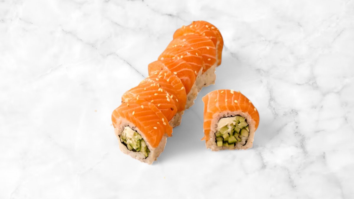 kylmäsavustettu lohi, tuorejuusto, avokado, kurkku, mozzarella, teriyakikastike, ruohosipuli
