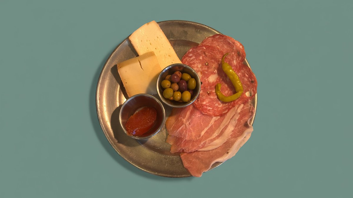 sliced meats, cheese with jam, olives, fresh focaccia & olive oil