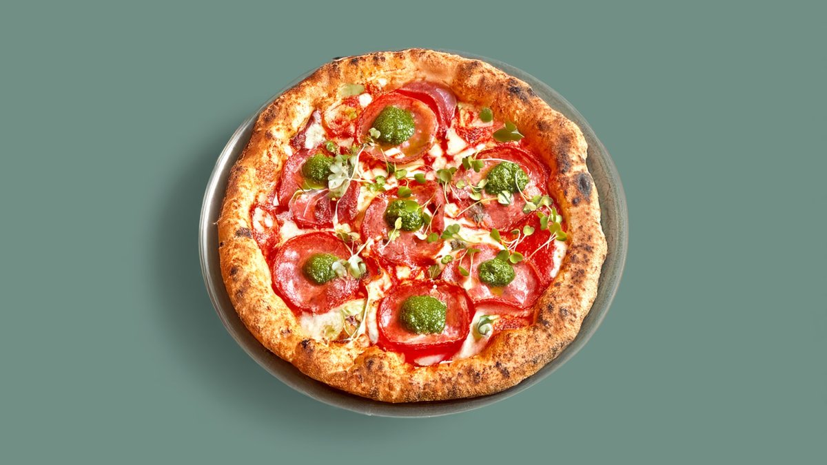 pomodoro pelati, fior di latte mozzarella, toscana salami, rocket pesto & extra virgin olive oil