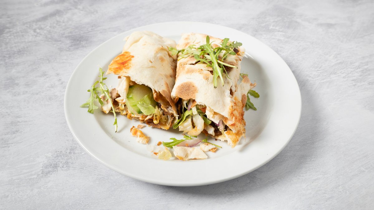 Kebab, leipä pilkottuna, salaatti, jogurttikastike