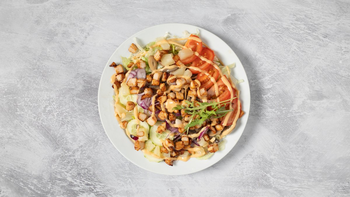 Salaatti, tomaatti, sipuli, kurkku, ananas kuutio, kana