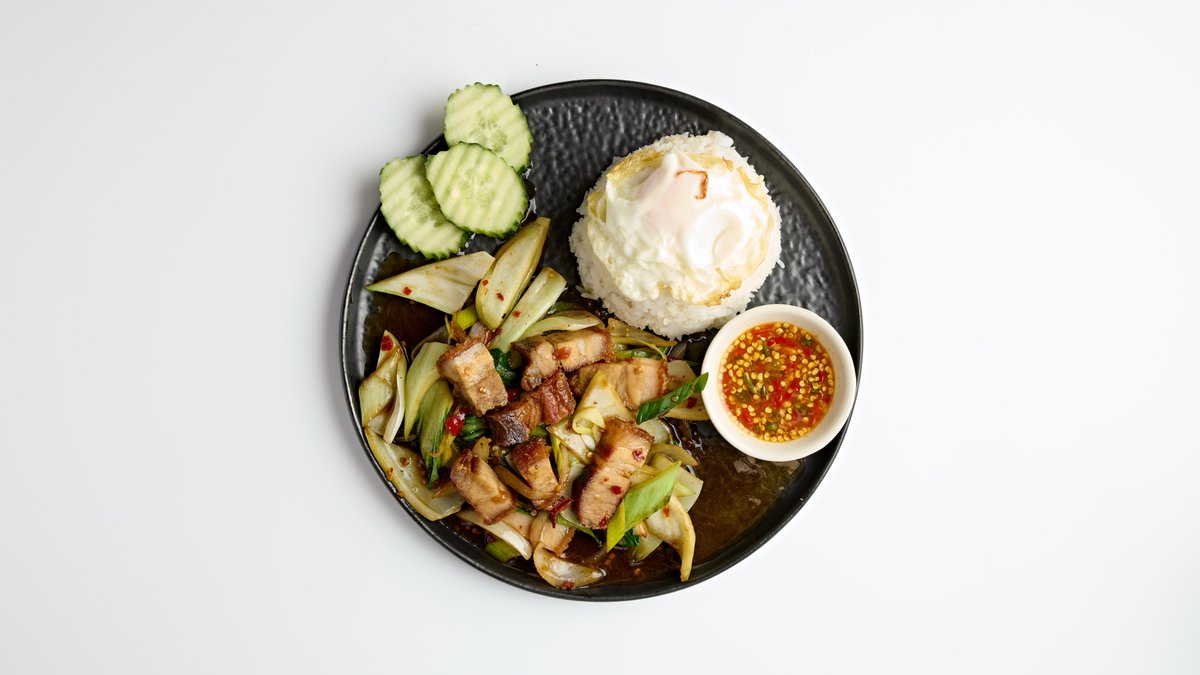 Rapeaa possun kylkeä, pakchoita, valkosipulia. chiliä, paistettu kananmuna