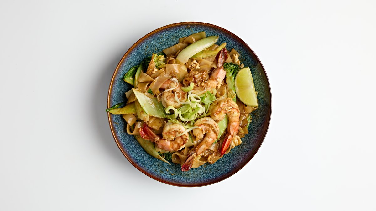 Paistettuja riisinuudeleita, chiliä, thaibasilikaa, parsakaalia, pakchoita ja valinnainen täyte