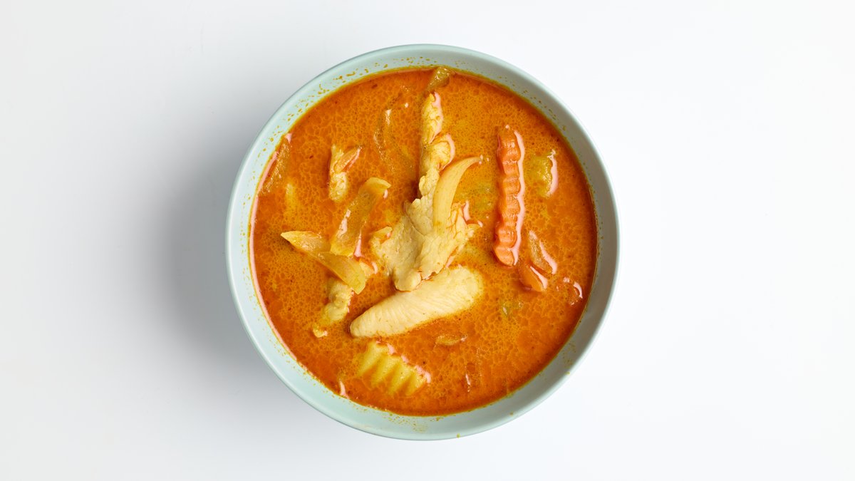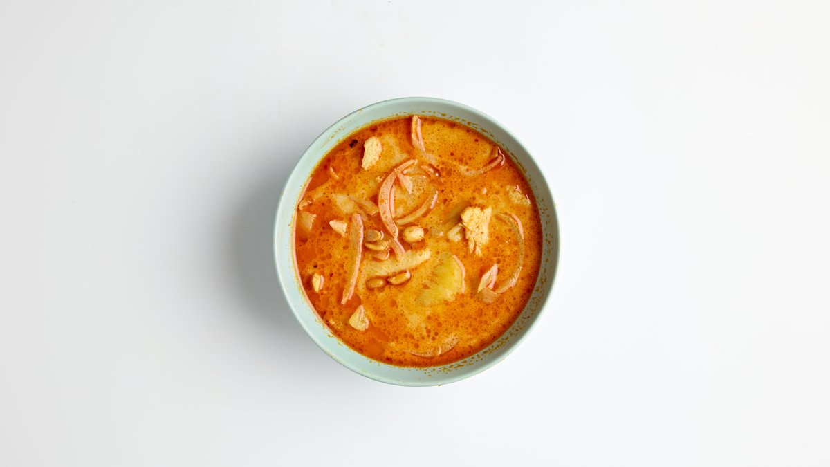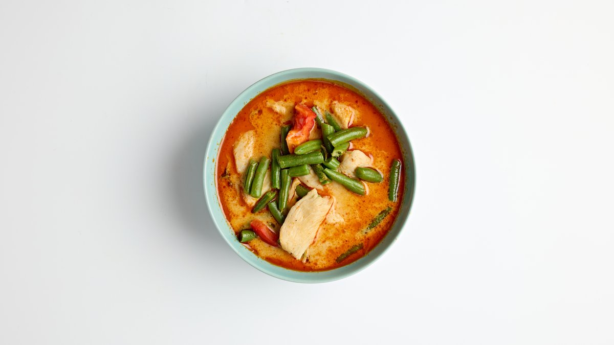 Tulinen kookoscurry, tuoretta punaista chiliä, thaibasillikaa, thaimunakoisoa, bambua ja valinnainen täyte