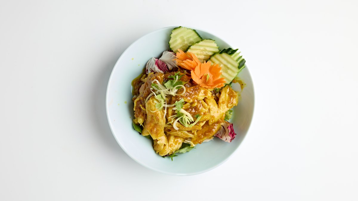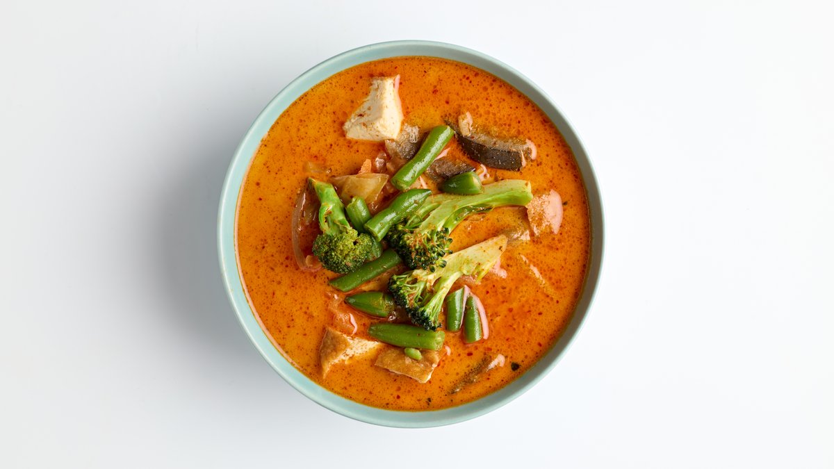 Aromaattisen tulinen kookoscurry, sokeriherneitä, kaffirlimenlehteä ja valinnainen täyte