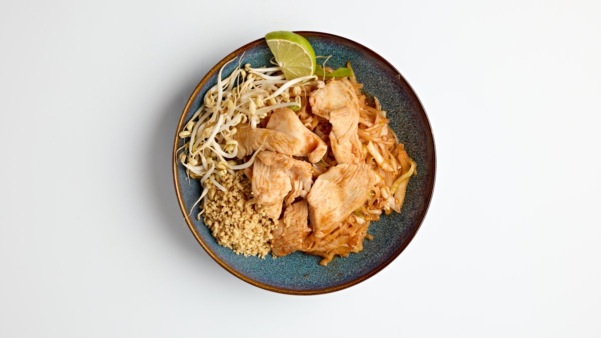 Paistettuja riisinuudeleita, tamarindia, kananmunaa, ruohosipulia, punasipulia, ituja, rouhittua maapähkinää ja valinnainen täyte