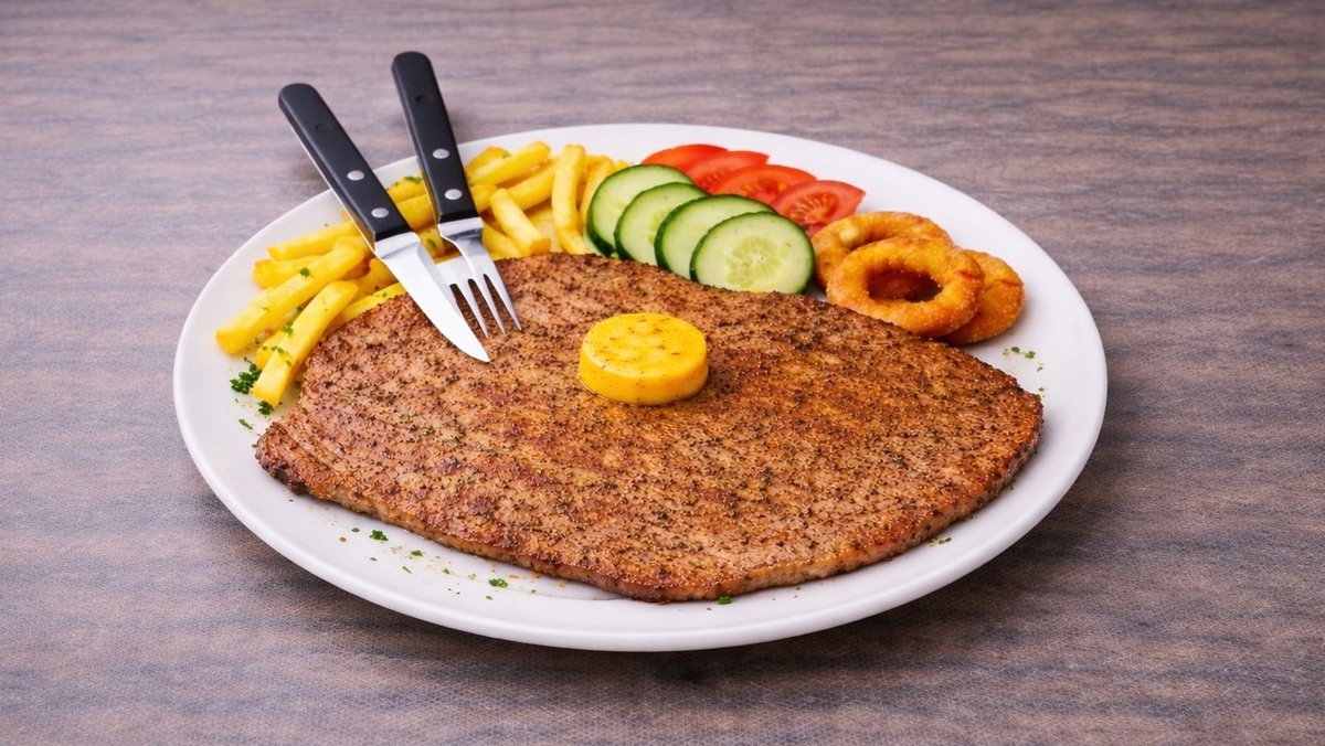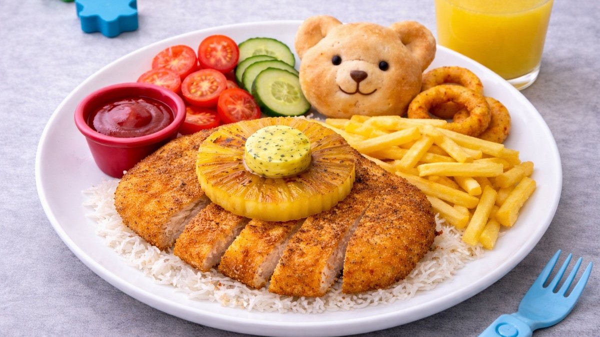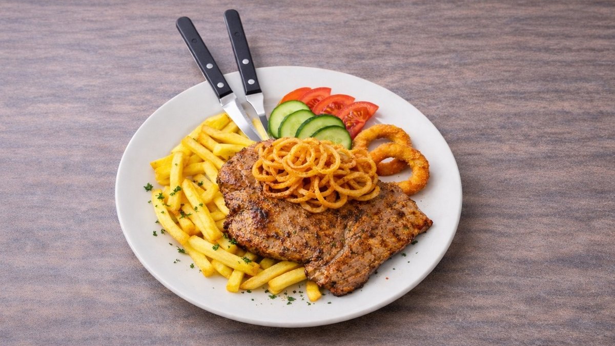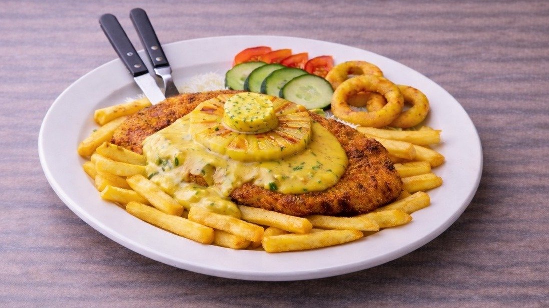 1x125 g Pihvi, ananasrengas, salaatti, tomaatti, kurkku, ranskalaiset, 0,33l juoma